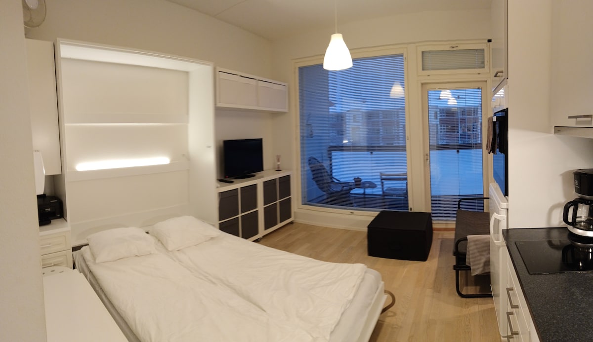 Lys studiolejlighed med balkon og smuk udsigt over søen. Der er gratis parkeringsplads i nærheden af lejligheden. Luftkildevarmepumpen holder lejligheden kølig, selv i sommervarmen. Lejligheden har senge til fire personer: en dobbeltseng (160 cm) og en sovesofa (160 cm). Indkvarteringen omfatter sengetøj og håndklæder. Der er elevator i huset. >> Downtown Hämeenlinna 1 km >>Verkatehdas, teater og Suisto-klub 200 m >> Aulanko 4 km >> Jernbanestation 800 m >> Købmand 300 m >>Opladningssted for elbil 150 m