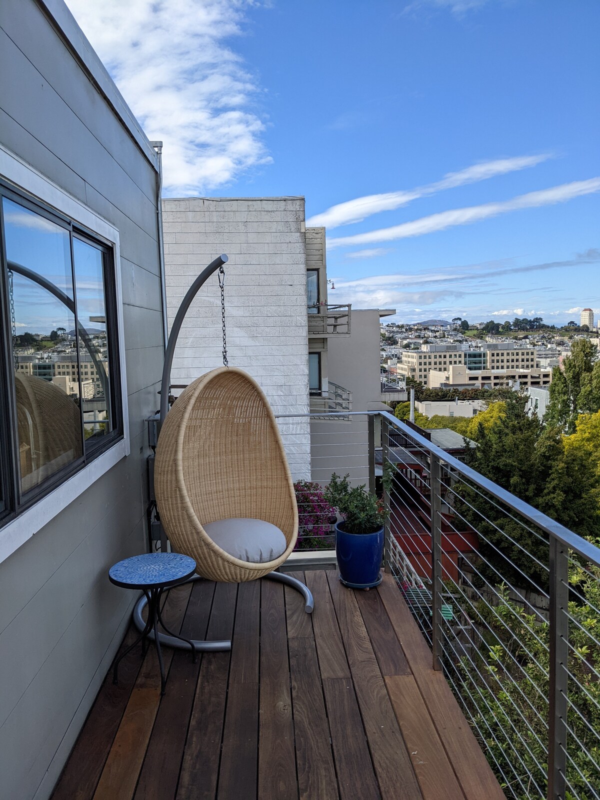Cozy up in the love seat by a TV with Roku 3, Hulu, and Netflix. This 3rd-floor master studio delivers an eclectic family atmosphere, plus a deck with verdant vistas. The spa-like bathroom has a deep soaking tube and separate walk-in shower which offers rain-dance mode together with a view of Mount Sutro. The studio is a convenient, kitchenless suite with an independent entrance on the 3rd floor of my house!
