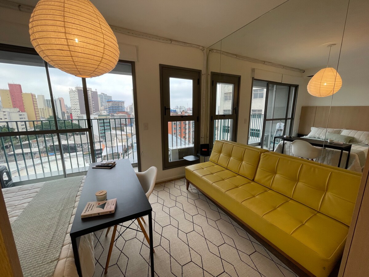 Hyggeligt Kitnet Ideel til korte ophold, hjemmekontor og lang sæson. 3 minutters gang til Liberdade-metroen - Wi-fi 500 MB - Loftsventilator - Maskinlaa 3 kg og tør 1 kg - Floor Varal - Samsung 50 smart-tv med justerbart stativ - Skrivebord med støtte til notesbog, lampe, ur med temperatur- og fugtighedsmarkør. - Udtrækkeligt bord - Minibar - Vandfilter – Køkkenets luftrenser - Induktionsmadlavning - Mikrobølgeovn - Hårtørrer - Hygiejnisk bruser