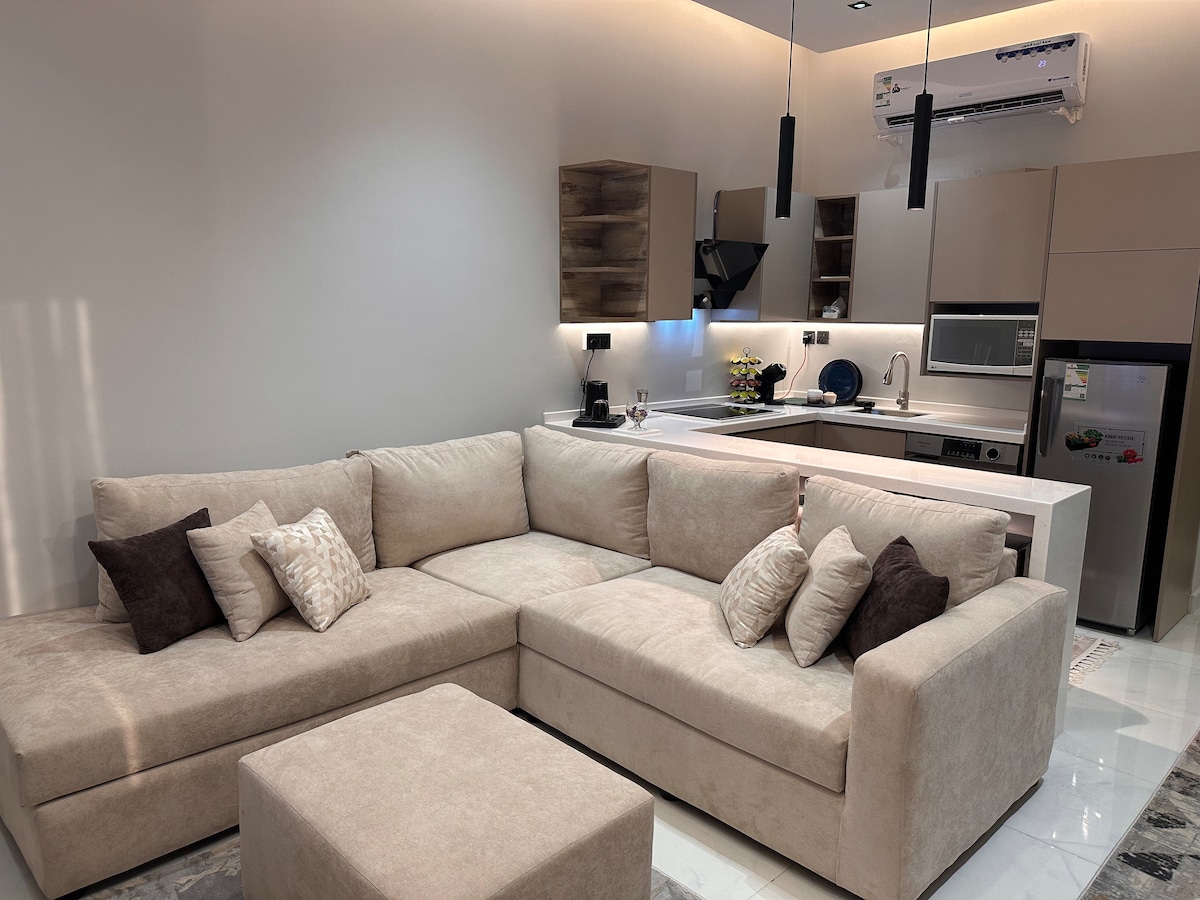 استمتع بإقامة فاخرة في هذه الشقة العصرية المكونة من غرفة نوم وصالة مريحة. الشقة مجهزة بكل وسائل الراحة التي تحتاجها، بما في ذلك مطبخ كامل لطهي وجباتك الخاصة، وحمامين أنيقة وحديثة .تقع الشقة في موقع هادئ وقريب من المعالم السياحية والمحلات التجارية والمطاعم مثالية للأزواج أو المسافرين المنفردين الباحثين عن إقامة مريحة وهادئة