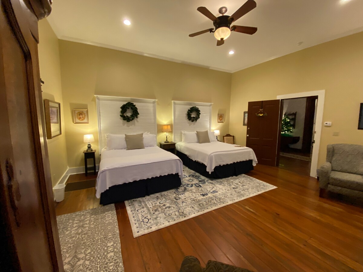 Dette smukke værelse, der ligger uden for stuen i hovedhuset på vores Jefferson Bed and Breakfast, er prydet med bordeaux, blå og nuancer af lyserød, perfekt til de victorianske omgivelser skabt af de antikke møbler. Dette dejlige værelse har en høj queensize-seng og et lille, men malerisk badeværelse med brusebad. Hvis du er på udkig efter moderne bekvemmelighed, har dette rum et fladskærms-tv til din fornøjelse og et lille opholdsområde. Dette romantiske værelse tager dig tilbage til en mildere og urolig tid.