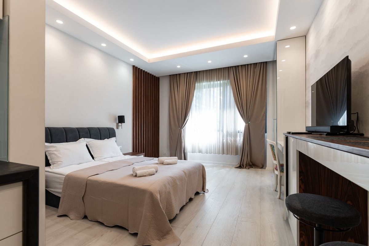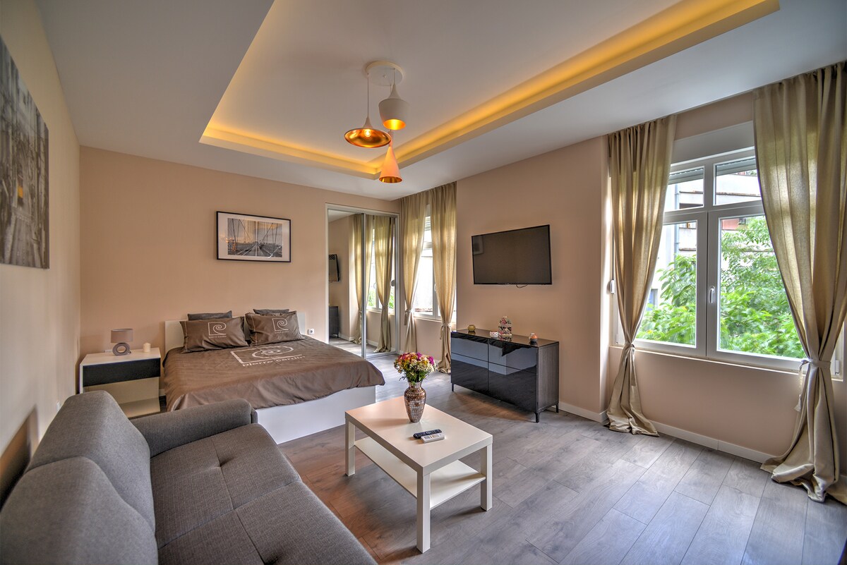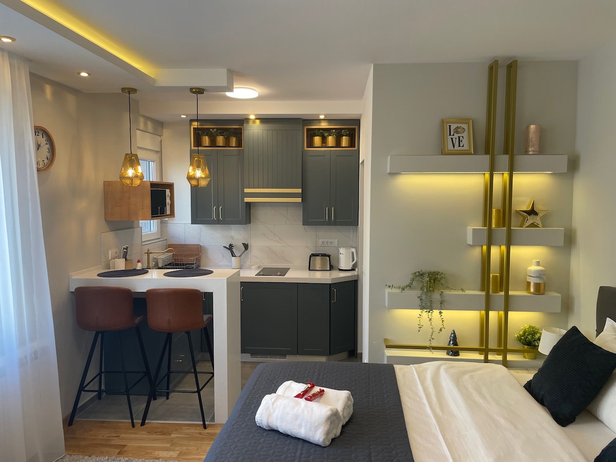 Gratis lufthavnstransport er tilgængelig for ophold på 10 nætter eller mere. Vores anden lejlighed er en moderne, multifunktionel etværelses i centrum, skabt på baggrund af mange års erfaring i gæstfrihedsbranchen. Den er designet til at kombinere komforten af et hotelværelse med et funktionelt køkken og er ideel til korte og længere ophold. Den centrale beliggenhed giver nem adgang til centrale steder i Beograd. Højhastigheds 100 Mbps Wi-Fi. Familievenlig, uden skarpe hjørner eller kanter.