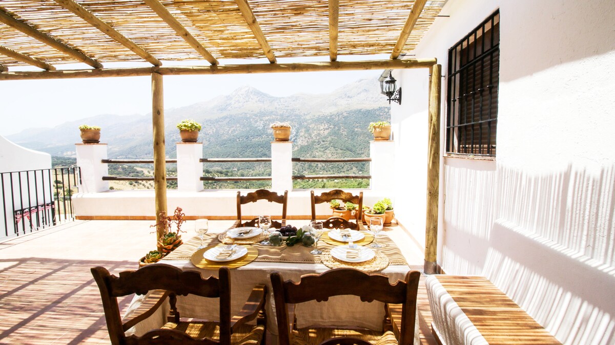 Mit splinternye økohus ligger i en lille dal midt i uberørt natur tæt på naturparken ikke langt fra Grazalema og med mange vandrestier rundt omkring og tæt på Embalse de Zahara. Under opførelsen af huset har vi brugt naturlige og genbrugsmaterialer, og solen leverer strøm via et solcelleanlæg. På de 3,5 hektar jord er der hovedsageligt oliventræer, og fra toppen har jeg en smuk udsigt over Sierra de Grazalema.