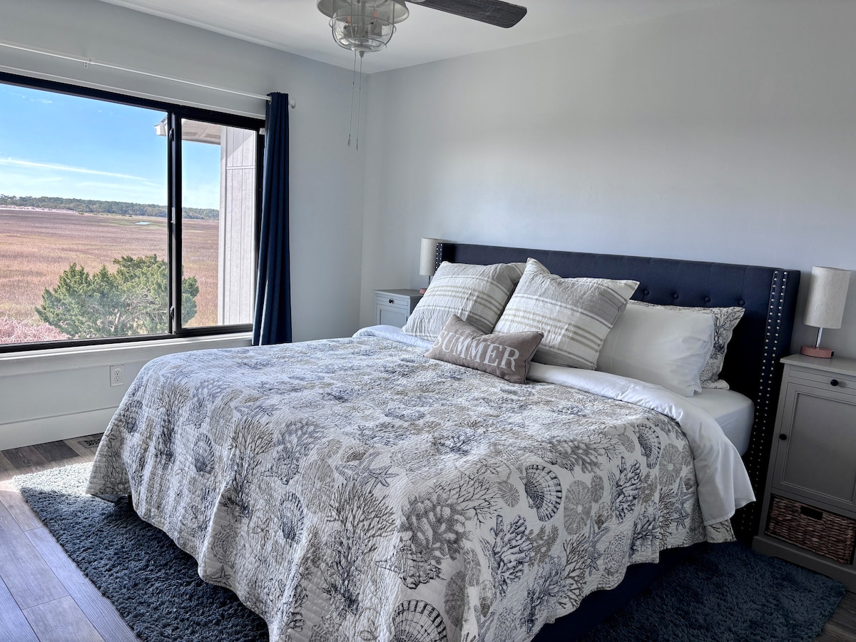 Tag til vores unikke, kæledyrsvenlige trætopshus ved vandet på Seabrook Island. Dette opdaterede retreat med 2 soveværelser og 2 badeværelser tilbyder udsigt over den rolige lagune og en hængekøje ved vandet. Omgivet af natur er det perfekt til en afslappende ferie. Nyd en kort gåtur til stranden, fællespoolen og fitnesscentret. Ideel til små grupper eller familier, der søger en rolig øoplevelse. Din private, forhøjede naturferie venter!