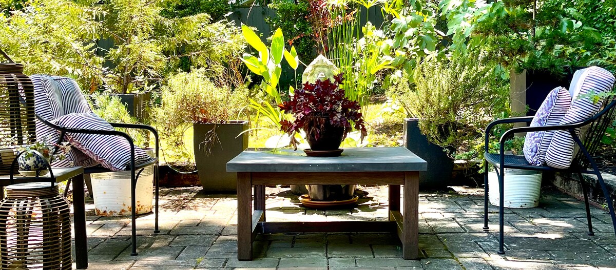 Denne pied-à-terre ligger mindre end 1,5 km fra Downtown Raleigh og er smagfuldt indrettet. Fuldt udstyret køkken, vaskemaskine/tørretumbler, masser af naturligt lys, to fjernsyn, indkørsel og en terrasse med udsigt til springvandet og haven. Nyrenoveret badeværelse og nymalet ydre. Tag en Uber med til centrum, og udforsk museer, restauranter og natteliv. Gratis kaffe og espresso. Månedlige+ ophold omfatter gratis rengøring hver anden uge.