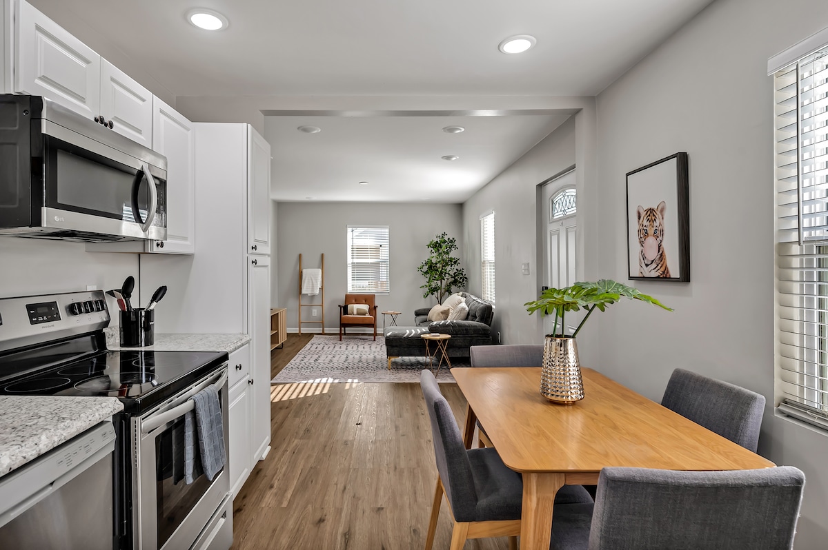 Ombygget med alle de bekvemmeligheder, du ønsker... blødt sengetøj, bløde puder, mørklægningsgardiner, overdimensioneret bruser, Keurig-kaffemaskine, behageligt familieværelse med stort tv, afslappende udendørsområde! Minutter til centrum, kongrescenter, PNC, Red Hat, Dorothea Dix Park, Walnut Creek, prisbelønnede fine spisesteder eller lokale dyk, bryggerier, butikker og I-440, hvilket gør en nem tur til lufthavnen. Stor indhegnet baggård til pelsbabyer (medtag dem i registreringen). Værten er let tilgængelig. Skal være 25 år eller ældre.