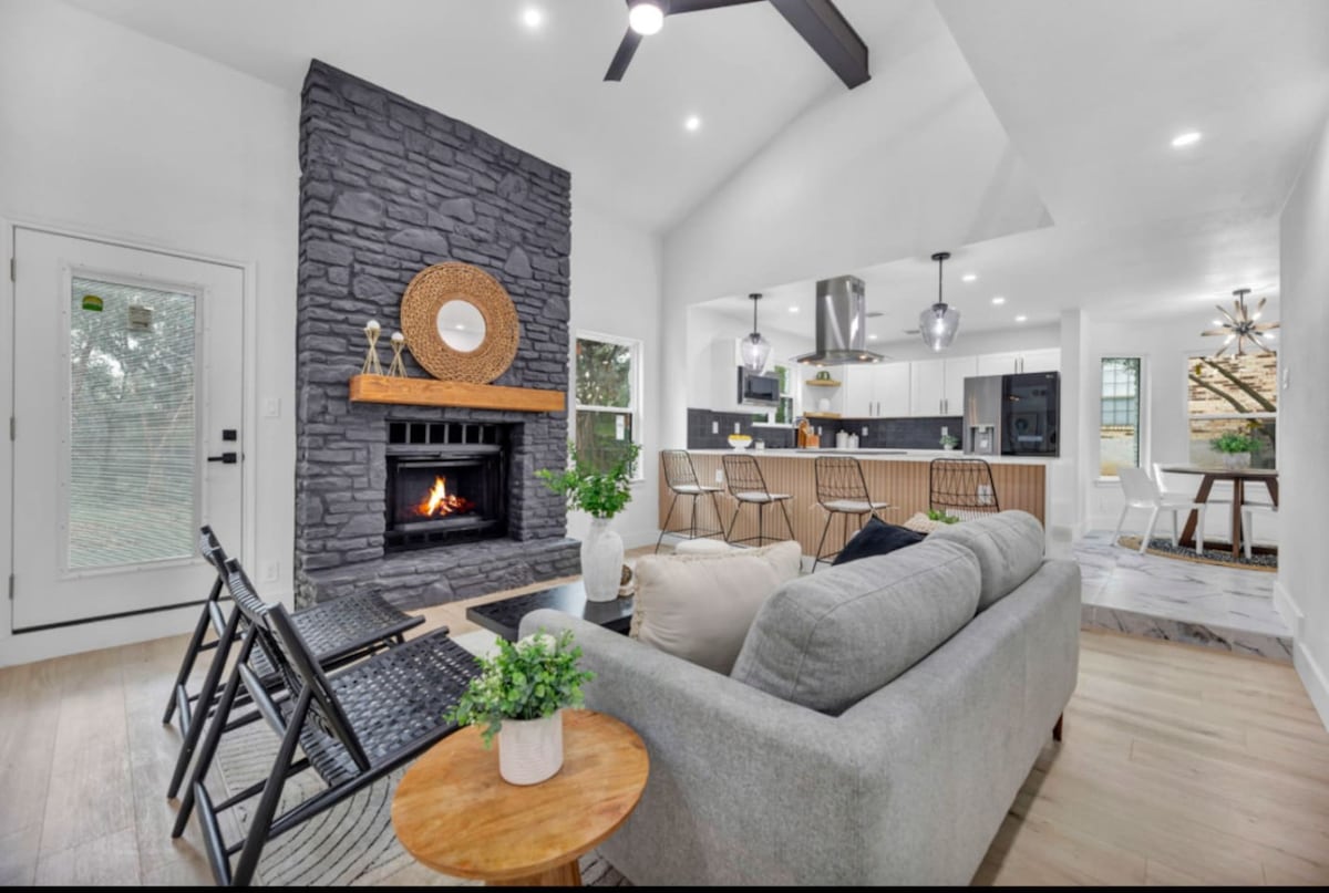 Slap af og leg i Sunny Haven 🌞 Denne charmerende 3BR, 2BA Austin retreat sover 8 (inkl. 1 sovesofa) og tilbyder lyst, åbent koncept med moderne stil og komfort. Nyd aftener ved pejsen🔥, grill i den indhegnede baghave, eller slap af med skyggefulde udendørs spisesteder og plænespil🎉. Garagen fungerer også som et livligt spilrum, så der er ekstra sjov. Kæledyrsvenligt og centralt beliggende. Perfekt til familier, par og grupper, der søger kontakt og et mindeværdigt ophold i det pulserende Austin.