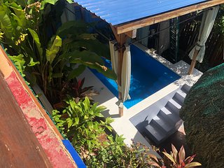 Ocean Palms Bungalow, en bolig med 1 soveværelse, omgivet af palmer, plumerias, hibiscus. Fantastisk udsigt over havet og haven, stort overdækket dæk Separat privat indkørsel og parkering. En måned eller derover foretrækkes. Ocean Palms drives af et solcelleanlæg med batterier, ingen strømstød eller strømafbrydelser. Klimaanlægget er direkte til elselskabet, og brugen vil blive opkrævet i kontanter, når dit ophold er slut, i henhold til dit brug på den separate måler til klimaanlægget.