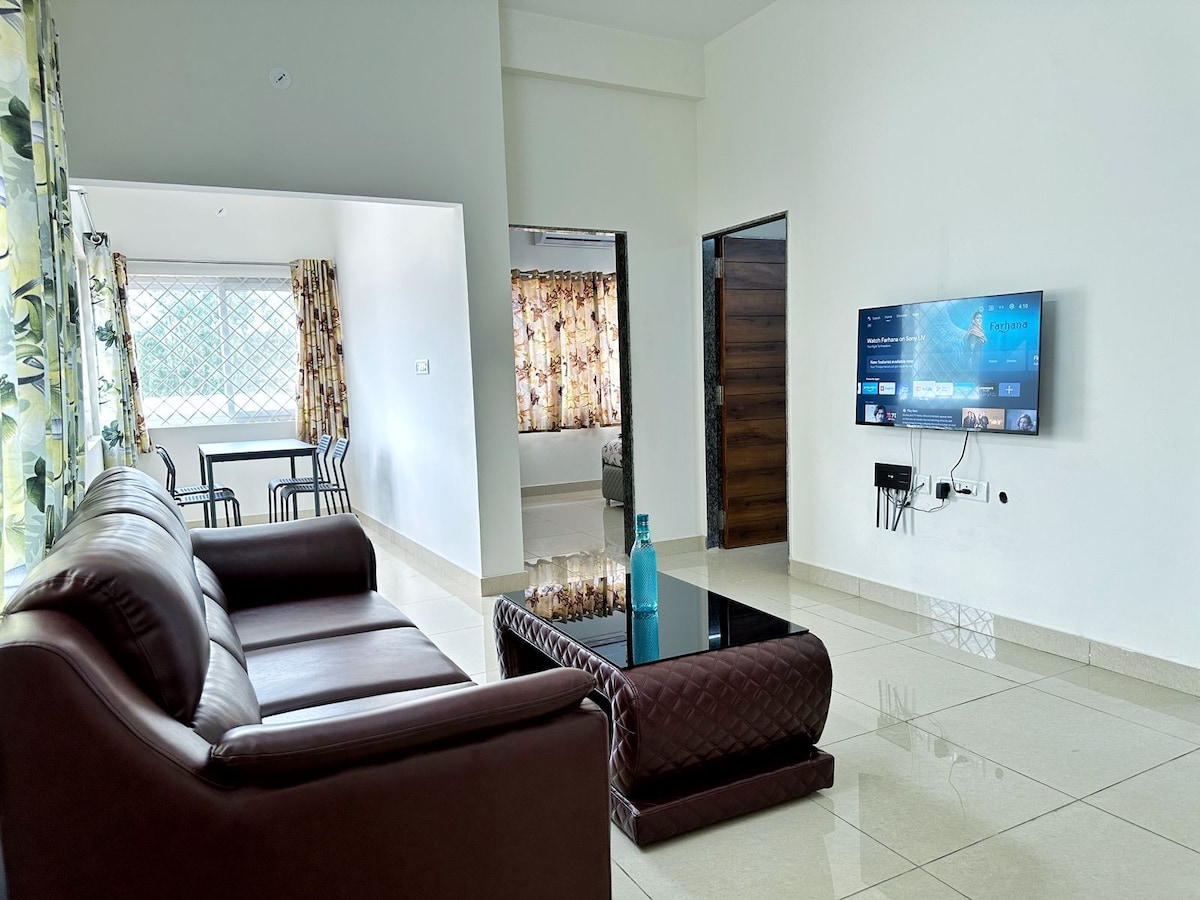 Velkommen til vores nyrenoverede, rummelige 1-BHK-lejlighed, der er ideel til par og familier, der søger komfort og bekvemmelighed. Soveværelset har en queensize-dobbeltseng og en blød ortopædisk madras, så du kan få en god nats søvn. Slap af i den store stue med et 43-tommers smart-tv, lynhurtig wi-fi og dedikeret arbejdsplads. Har et superrent badeværelse med basisting. Det fuldt udstyrede køkken indeholder basale ingredienser, apparater af høj kvalitet og service til dine kulinariske eventyr.