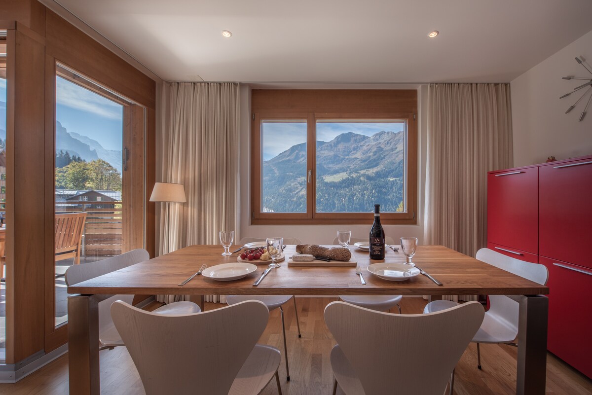 This luxury ground-floor apartment of 85m2 for up to 5 people, located in Grindelwald Grund, is a few steps away from the Jungfrau & Männlichen. It offers breathtaking views of the Eiger and an authentic upscale Swiss experience in a chic alpine style. High-quality materials, design furniture, en-suite master BR, central heating, fully equipped kitchen, garden, fast Wireless, 165cm Smart TV w/100+ channels, Netflix, Bluetooth music box, towels, bed sheets and 1 free car park during your stay.