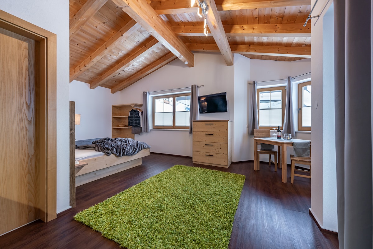 I vores studie finder du den perfekte base til dine udendørs eventyr, kun 3 min. Gangafstand fra Finkenberger Almbahn! Det er et større lyst værelse med et meget godt og nyt køkken, brusebad og toilet og en stor balkon, hvor du kan nyde solen og udsigten over bjergene om eftermiddagen. Om morgenen sætter jeg friske boller foran døren, hvis du ønsker det. Med naturen i hjertet glæder vi os til at se dig!