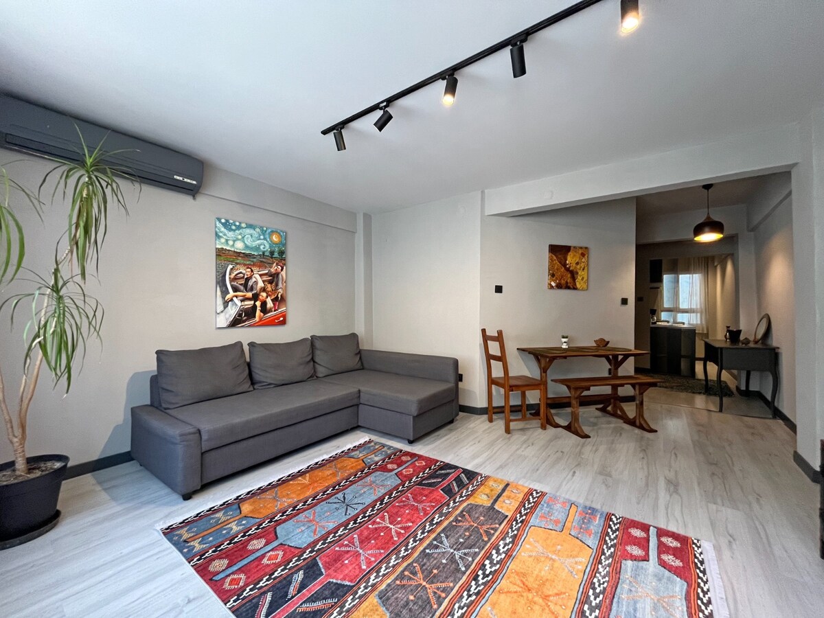 Denne søde og komfortable lejlighed på Umbrella Street, som er dekoreret med forskellige vægmalerier og blomster og har fået sit navn fra de farverige paraplyer på "loftet på gaden", ligger 5 minutter væk fra al offentlig transport. Alt er blevet taget i betragtning for vores gæsters komfort i vores hus, som har en perfekt dekoration.