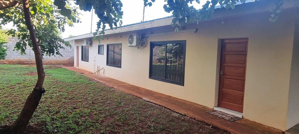 Located just off the Kafue Rd in the south of Lusaka and close to nearby main malls and just a stone throw away from the southern highway. Situated in a beautiful garden with established trees and manicured lawns where you will only hear natural sounds surrounding you. Truly a home away from home with a clean comfortable space to relax or work remotely ft. a private pool and a veranda with outdoor seating. Suitable for travelers on business or a family.