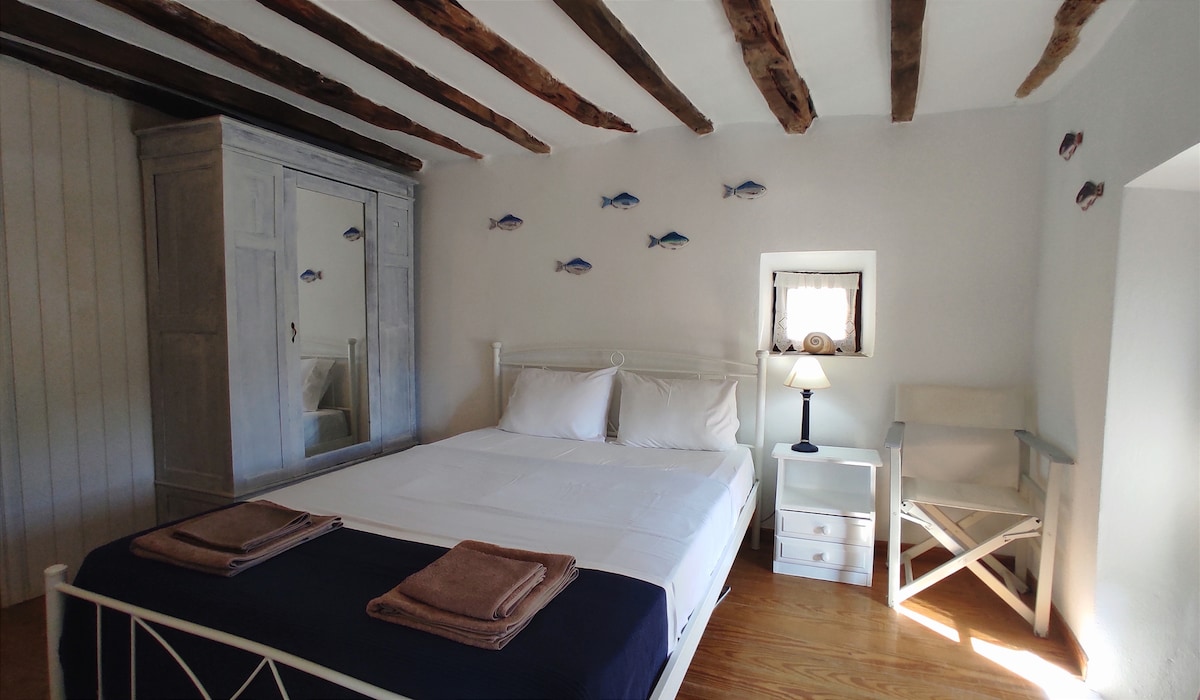 For at nå frem til vores bolig, behøver du ikke at gå mere end 300 meter fra det sted, hvor du steg af. Du finder det til højre i et toetagers hus, på det mest centrale punkt på Kamares-stranden. Med følelsen af, at du næsten kan hoppe ud fra din balkon og svømme i havet, går du op ad de maleriske trapper, der fører dig ind i boligen. Et velholdt, lyst rum, der vil være dit referencepunkt i de kommende dage.