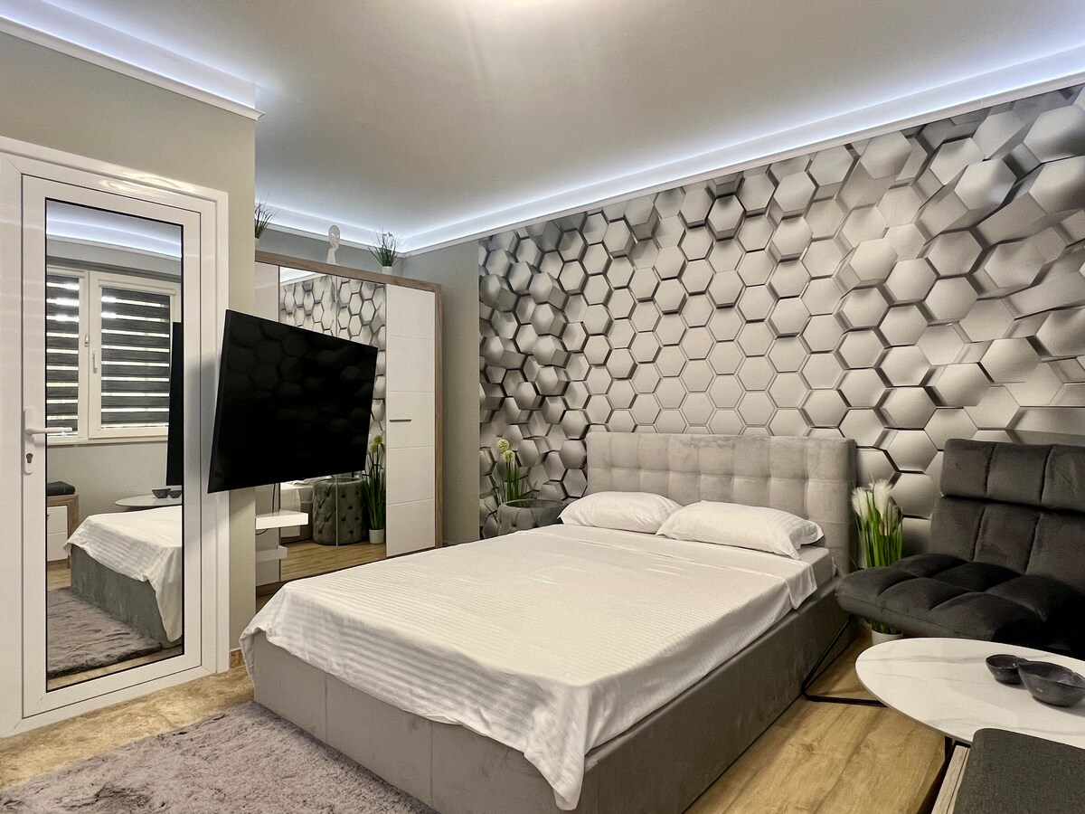 Nyd dit ophold på vores topbeliggenhed i Varna! Denne lejlighed med et soveværelse er møbleret i en unik klassisk stil og tilbyder indendørs jacuzzi! Forkæl dig selv med den ultimative luksuriøse oplevelse med vores jacuzzi-lejlighed, hvor kombinationen af komfort, elegance og en enestående udsigt vil skabe minder, der varer hele livet.