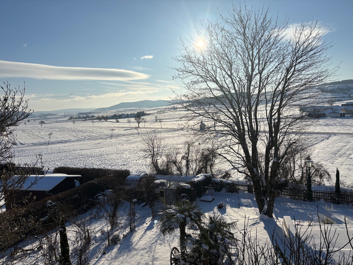 38 lyse og hyggelige kvadratmeter med egen indgang, beskyttet haveområde, sauna, bordtennis, vandreture i Gänsgraben til Heidenstatt ... Cykler til vinprøvning, både til floden og søen, og det er gratis hos os. Og Josephsbrot, det virkelig gode bageri med café, findes i landsbyen! Susanne er ungdomstræner. Som spejlmager driver jeg Østrigs sidste traditionelle spejlværksted. Vi glæder os til at se jer!