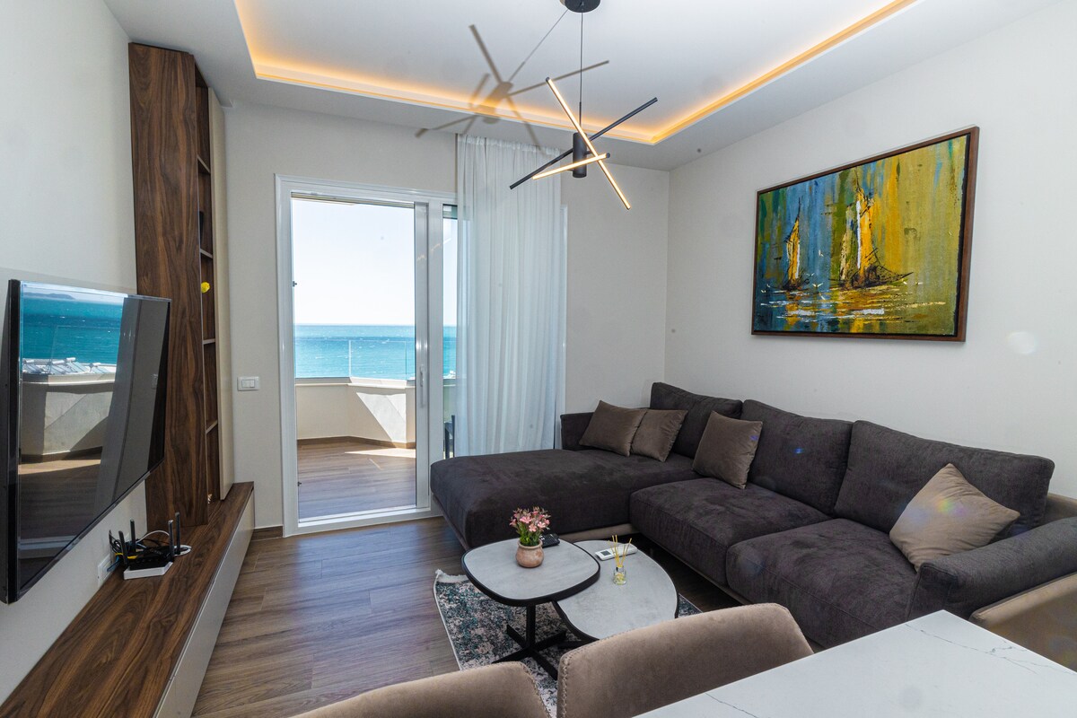 Sunny and panoramic apartment offers the most spectacular views of Vlora Bay. You can enjoy the stunning blues and greens of the sea and to feel the comfort and peace in the most coveted area.The residence where the house is located is newly built, the apartment total area is 120m2 and has two balconies overlooking the sea. One balcony belongs to the living area and the kitchen, while the other to the matrimonial room, the apartment has another room furnished with 2 single beds.