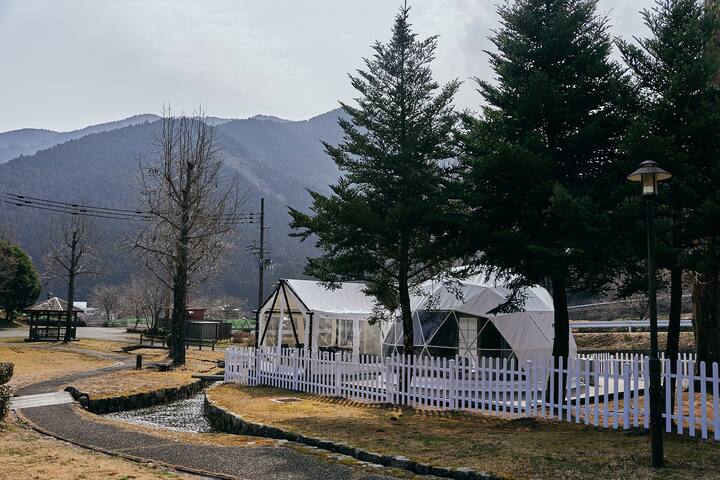 Cirka 40 minutter fra Himeji City, Kamikawa Town ligger inden for 1 time og 30 minutter fra Keihanshin næsten i midten af Hyogo præfekturet med fremragende tilgængelighed. Kamikawa i Hyogo-præfekturet er rig på natur, herunder Tomine-plateauet, der er berømt for sin sølvgræsprærie. Glampingfaciliteten "glampark Hotel Monte Rosa" blev etableret i dette område. Værelserne er indrettet i blå og hvide toner for at skabe et billede af friskhed og renlighed for et afslappende ophold.