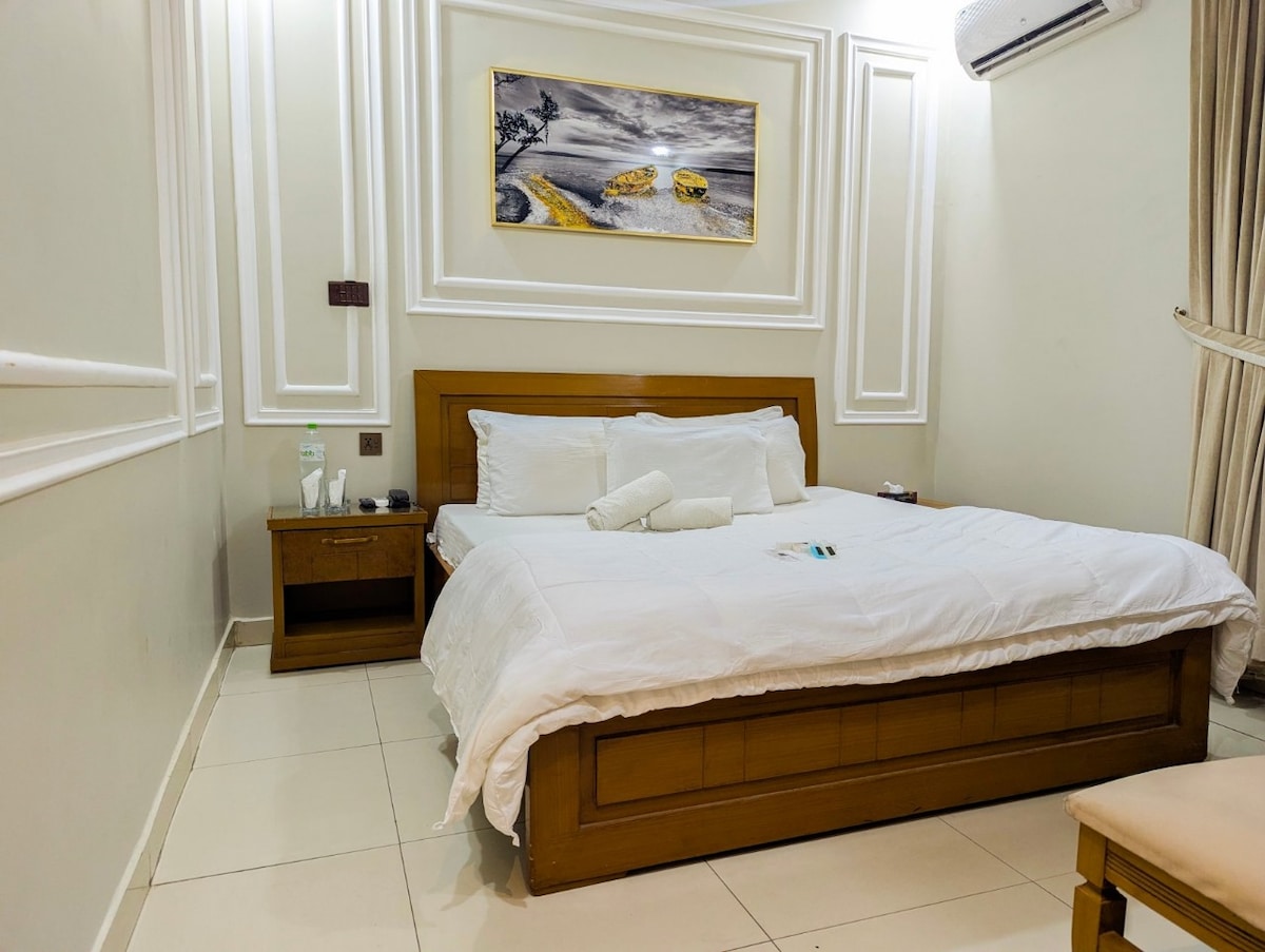 Dette komfortable dobbeltværelse er ideelt til 2-3 gæster og tilbyder alle basisting til et afslappende ophold. Værelsesfaciliteter: Dobbeltseng med plads til 2-3 gæster Konvertibord og arbejdsplads Hotelfaciliteter: Adgang til fitnesscenteret 24/7 Roomservice Sikker parkering Madsteder i nærheden, marts og hospitaler Morgenmad og ekstra madrasser (ekstra gebyr) Husregler: Rygning forbudt Ingen ugifte par Ingen alkohol Nyd dit ophold i hjertet af byen med alt, hvad du har brug for, kun få skridt væk!