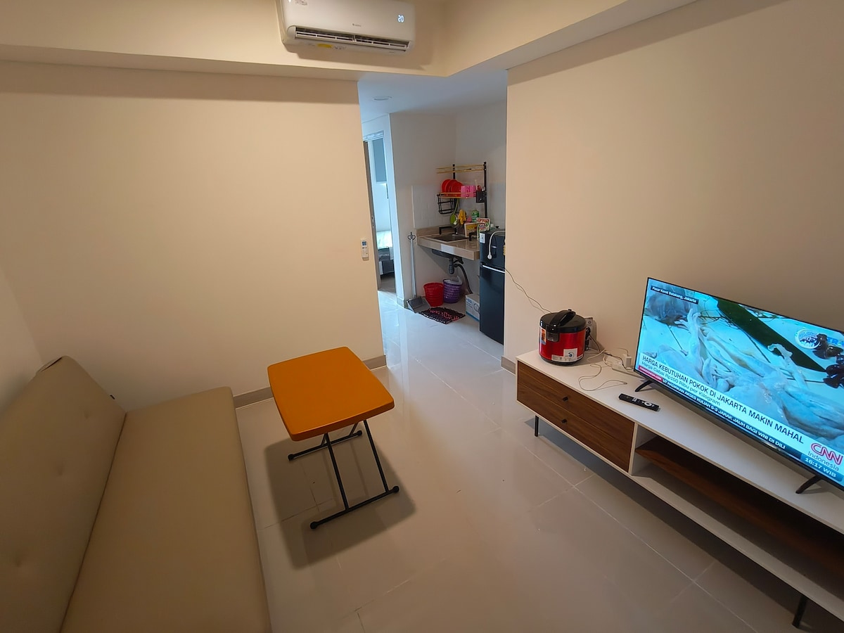 Apt 2 kamar dengan: 1. Kamar utama dgn kasur queen size (160x200) , sprei, selimut & lemari baju besi full kaca 2. Ruang serbaguna dgn sofa bed kulit (107x180) & meja . Ruangan ini bisa buat tidur, kerja, mini bioskop, gaming room. Ruang tamu ada sofa bed kulit (107x180) dan tv 40", rak tv. AC, bantal ada di semua ruangan. Kamar mandi ada water heater. Dapur ada kompor listrik, utensil, kulkas Balcony ada mesin cuci mini & jemuran. Cukup jalan kaki ke food court 24hr, cafe Luas 42m.