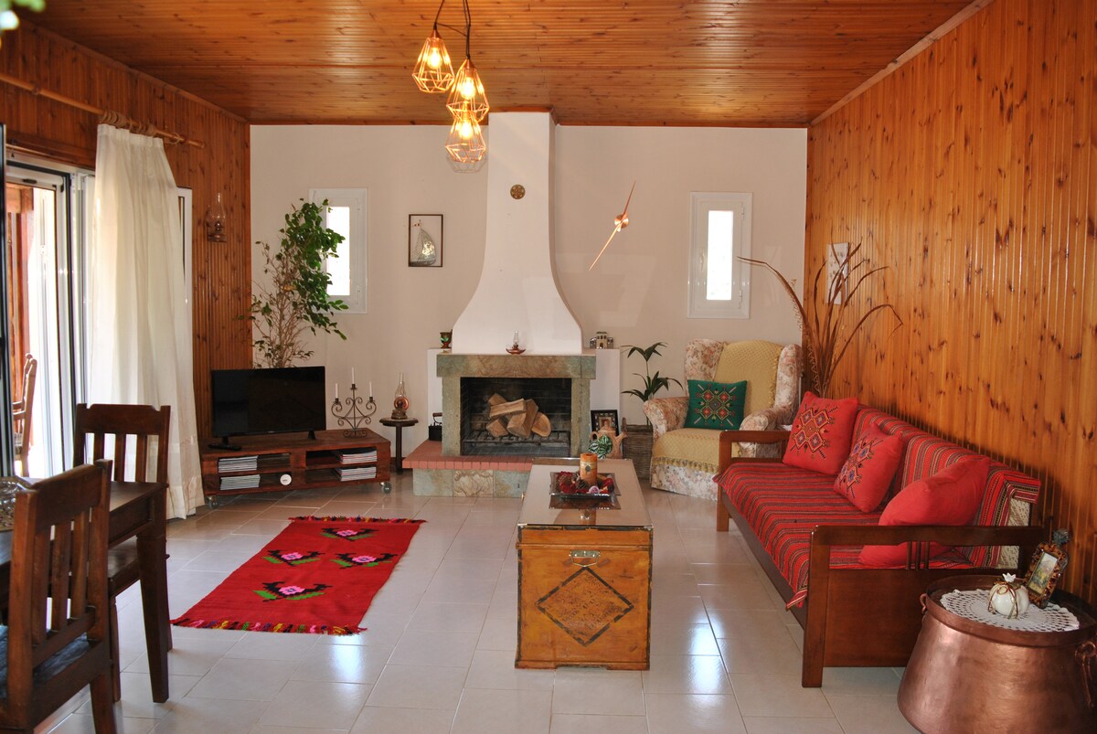 Philoxenia is about being friendly to a stranger, in a particularly warm and generous way. This is what we offer as an experience. Our house is made of stone and wood. Sun light is getting in every room from plenty of windows.The house provides a fully equipped kitchen and a living room with a fireplace. There are two bedrooms,each one with a private bathroom and air condition. You would find all you could possibly need. The best part of the house is its beautiful, private, full of green yard.