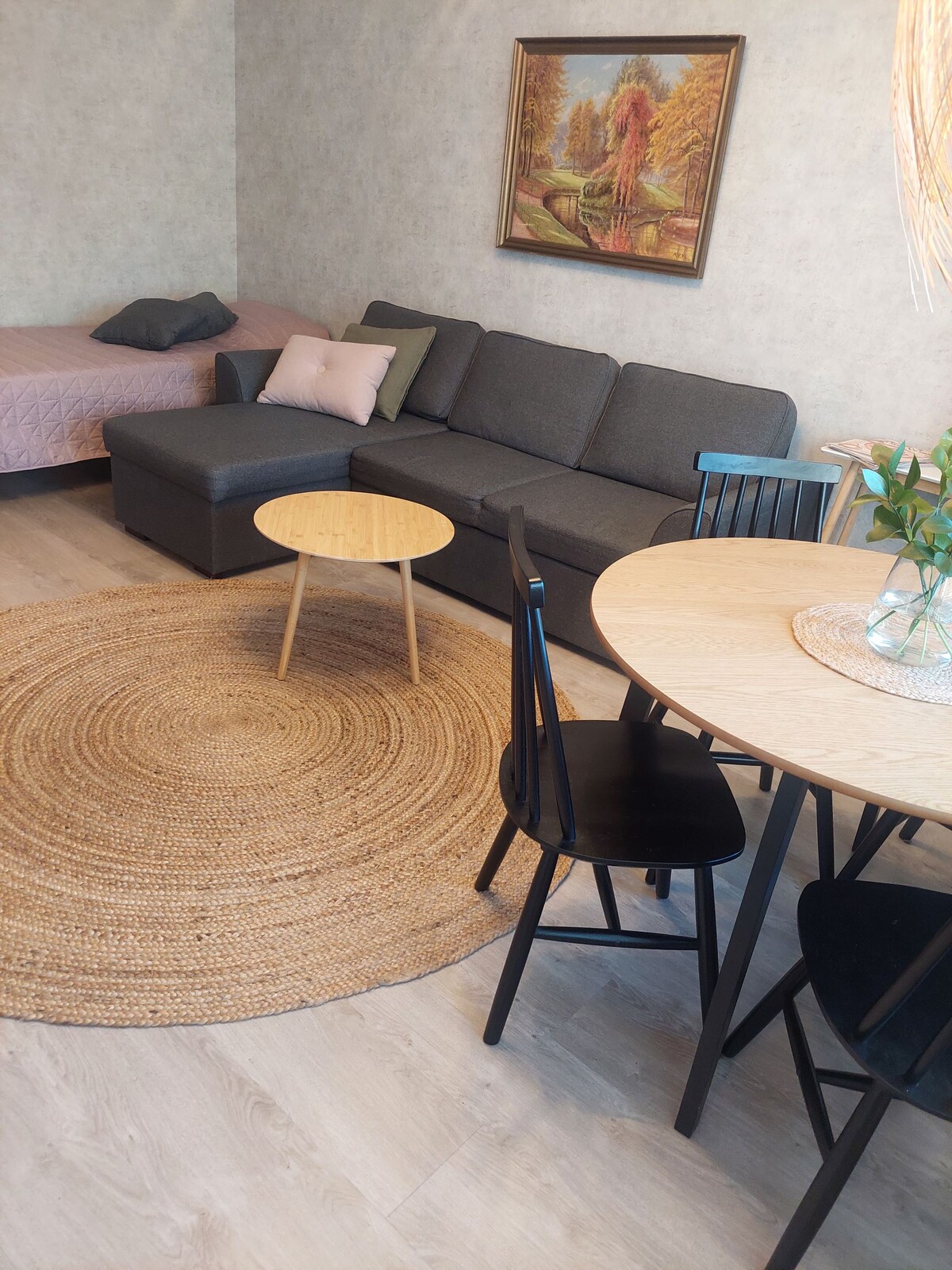 Et studie med sauna og balkon, der ligger tæt på byens centrum. Senge til fire. Dobbeltseng og sovesofa. Sengene er redt, og håndklæder er inkluderet. Brug duftfri rengøringsmidler. Der er grundlæggende morgenmad til kaffe, te, grød, müsli osv. i skabet. Gratis parkering foran huset. Rygning forbudt i lejligheden. Der er en bordventilator i lejligheden. Indtjekning med låseboks. Boligforeningen er stille, så du kan slappe af efter din rejse.