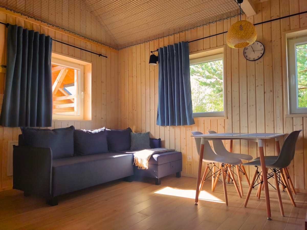 En eksklusiv hytte, den eneste på ejendommen, indhegnet, uden andre hytter, for folk, der leder efter fred og ro, perfekt til familier. Året rundt, med en pejs, der ligger kun 30 minutter fra Gdansk, omgivet af grønne områder, af dammen, ved siden af heste. Hele området er på ca. 60 tusind m2. Der er tid til at slappe af og genoplade batterierne. Omkring enge, skove og en sø inden for gåafstand. En hytte, der er perfekt til en 2+2-familie, men der er også plads til 6 personer