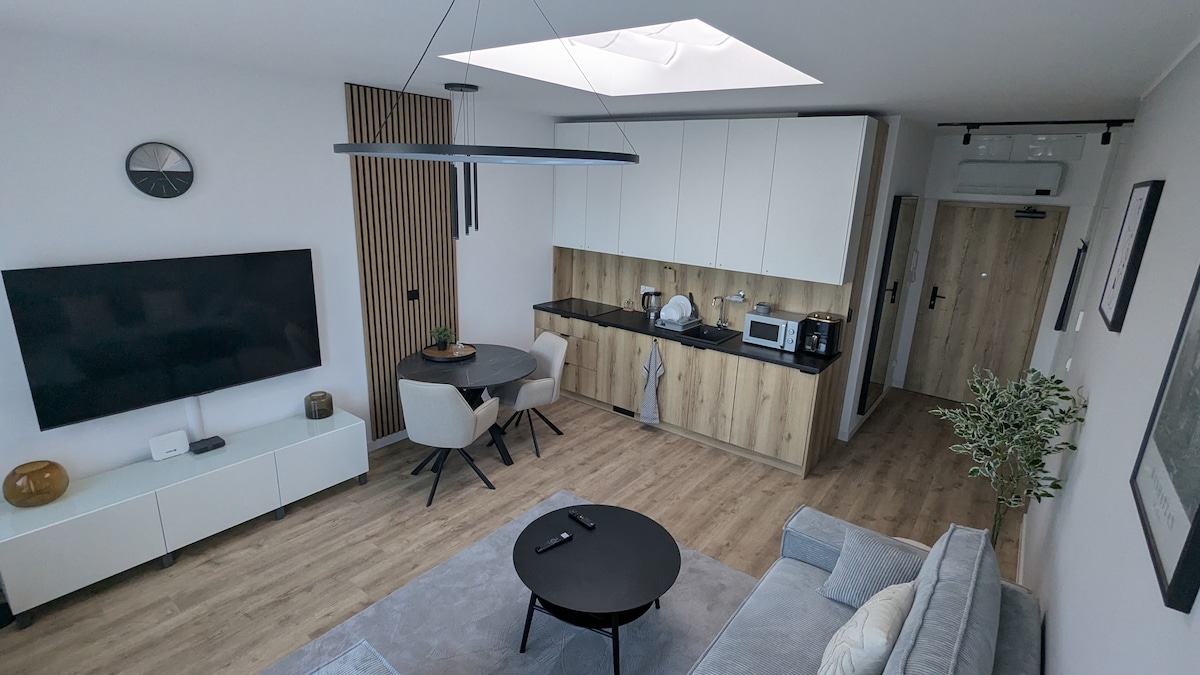 Moderne lejlighed med udsigt over byens vestlige skyline. Et unikt sted med en smuk terrasse på øverste etage giver en uforglemmelig udsigt. Lejligheden består af en stue med et fuldt udstyret tekøkken, et soveværelse med en rummelig garderobe, et badeværelse og en terrasse. Du har alle de nødvendige ting - en kedel, et strygejern, en tørretumbler, vaskekapsler, kaffe, te, basale krydderier. Lejligheden er perfekt til weekendturering og længerevarende ophold.