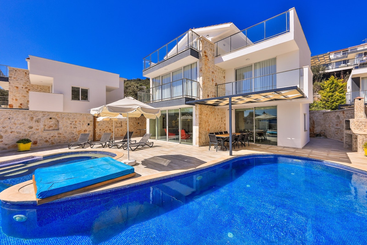 Kalkan merkeze yaklaşık 3 km olan villamızın yatak odasında jakuzi ve ebeveyn banyosu bulunmaktadır. Oturma odası ile birleşik açık plan mutfak mevcuttur. Geniş havuz terasında yemek masası, 2 şezlong, şömine ve 2 kişilik salıncak; villamız içinde ihtiyaç duyabileceğiniz mobilya mutfak araç gereçler vardır. Villamızın havuzu yerden yüksek olmakla birlikte, havuz terası ahşap çitlerle çevrilmiş ve korunaklı hale getirilmiştir. Muhafazakar aileler ve balayı çiftleri için her şey düşünülmüştür.