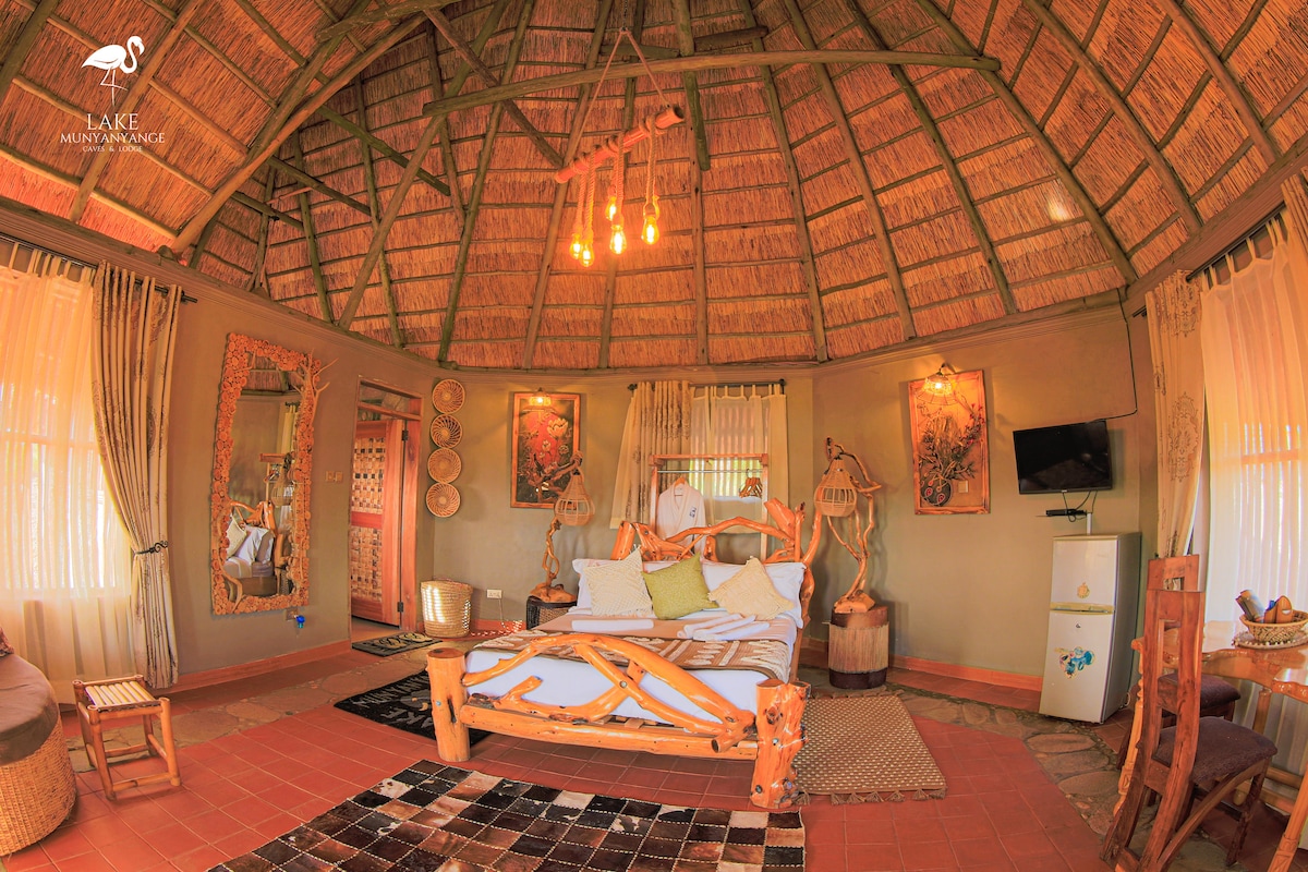 Unique Single Cottage with Lake View, sunrise and sunset view. At a distance a view of Rwenzori Mountain Ranges. Warm shower, Reading Table, and spacious enough for a couple. Spacious Balcony with table suitable for breakfast, dinner, snack or drink as you watch the beauty of Flamingos on Lake Munyanyange.