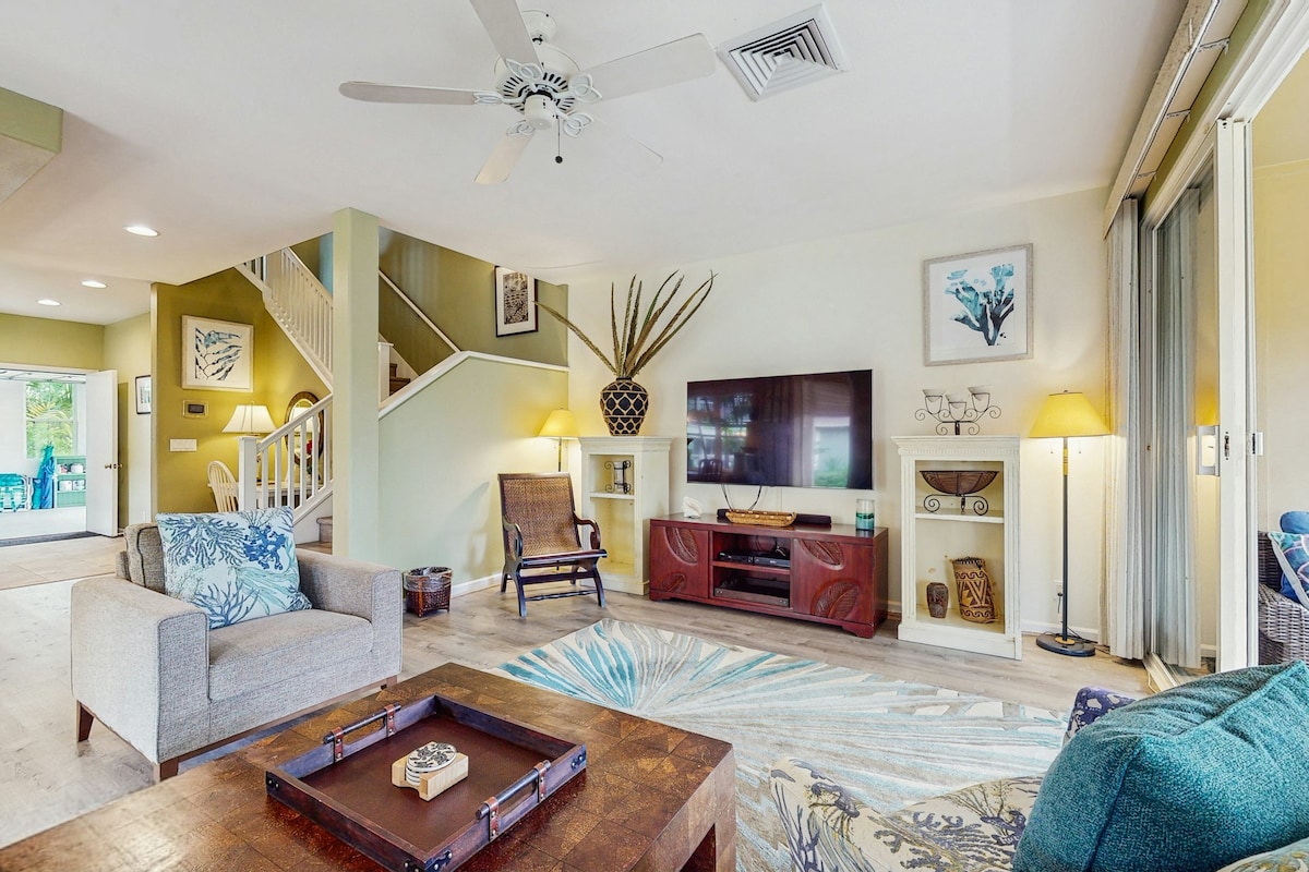 NYHED! SOM SET PÅ HAWAII LIFE! Sæson 14, Ep 4, Hus 2 Opdateret 2bdrm/2 badeværelser byhus med 3 queensize senge! Nyd vores opdaterede lejlighed med 2 soveværelser, 2 badeværelser og moderne faciliteter i Princeville. Vores enhed i enden betyder en større følelse med naturligt lys og ingen naboer ovenpå. Vores rolige beliggenhed ligger ved siden af golfbaner, Westin Resort, hvor du kan nyde Starbucks og fine spisesteder. Tag på vandretur ned til Wyllie Beach, shop i det nærliggende Princeville Shopping Center, tag på vandretur til Queens Bath, og udforsk den nærliggende Hanalei Bay.