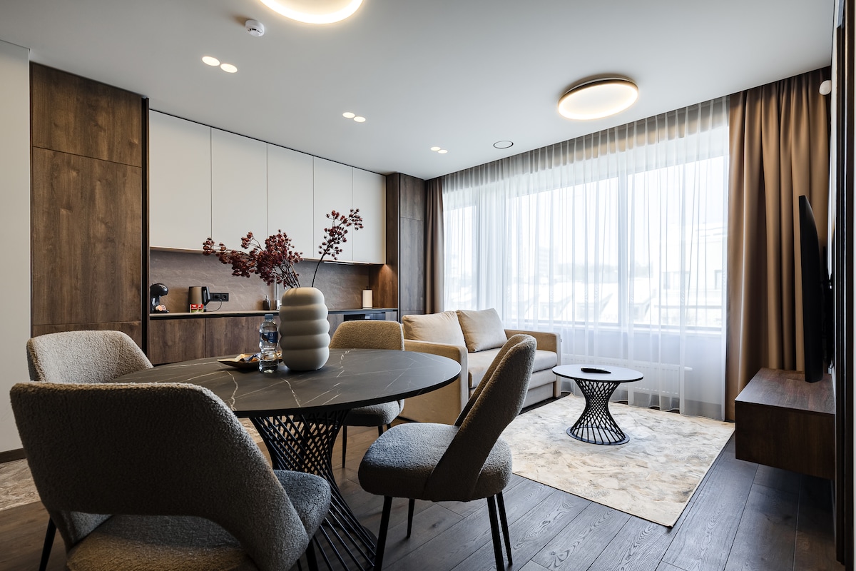 Fuldt møbleret 1-værelseslejlighed i Kaunas centrum. Få minutters gang til butikker, barer, restauranter, museer. 15 minutters gang til bus- og togstationer, 10 minutters gang til Azuolynas park. Lejligheden er 40 m2 og kan rumme op til 4 personer. Den har en 1,6x2m seng i soveværelset og en udtrækkelig sovesofa i stuen. Køkkenet er fuldt udstyret med alt, hvad du har brug for til at tilberede dine måltider (køleskab, opvaskemaskine, komfur, ovn, kedel, mikrobølgeovn osv.). Smart-tv og wi-fi.