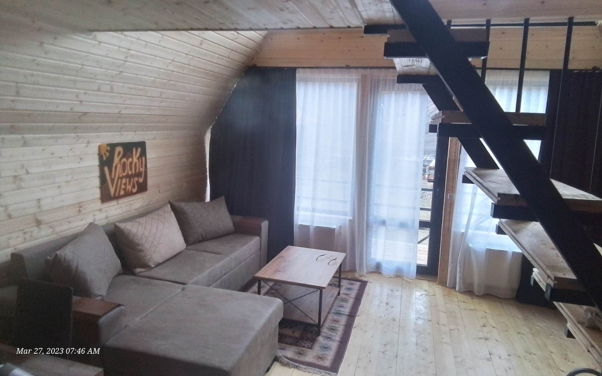 We offer our guests a cozy wooden cottage, in the center of Kazbegi, where you can escape the crowds and restore the peace and quiet in the mind. Enjoy breathtaking views from the window and spend quality time. Our wooden cottage is equipped with all the necessary amenities: a comfy sitting space, a mini kitchen, own bathroom, a loft-style bedroom and etc.