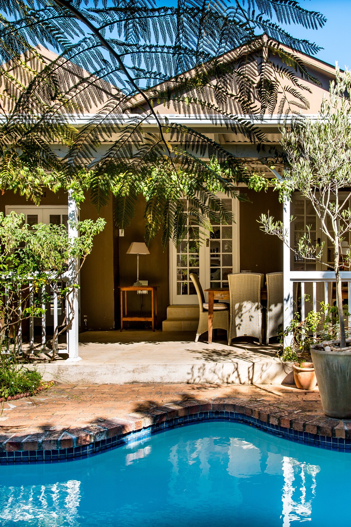 Historisk charme møder moderne komfort. Slap af i denne fuldt udstyrede gæstesuite uden indlagt strøm. Vi har alt, hvad du har brug for til dit ophold, herunder privat parkering, en pool og to retrocykler, som du kan bruge til at udforske nabolaget på. Fire venlige katte kommer måske forbi for at sige hej. Vi ligger en kort gåtur fra Southern Line-togstationen, som vil føre dig til Cape Towns pulserende hjerte og smukke strande på 20 minutter, eller bliv i lokalområdet og gå til 2nd Avenue, der er fyldt med fede restauranter og barer.