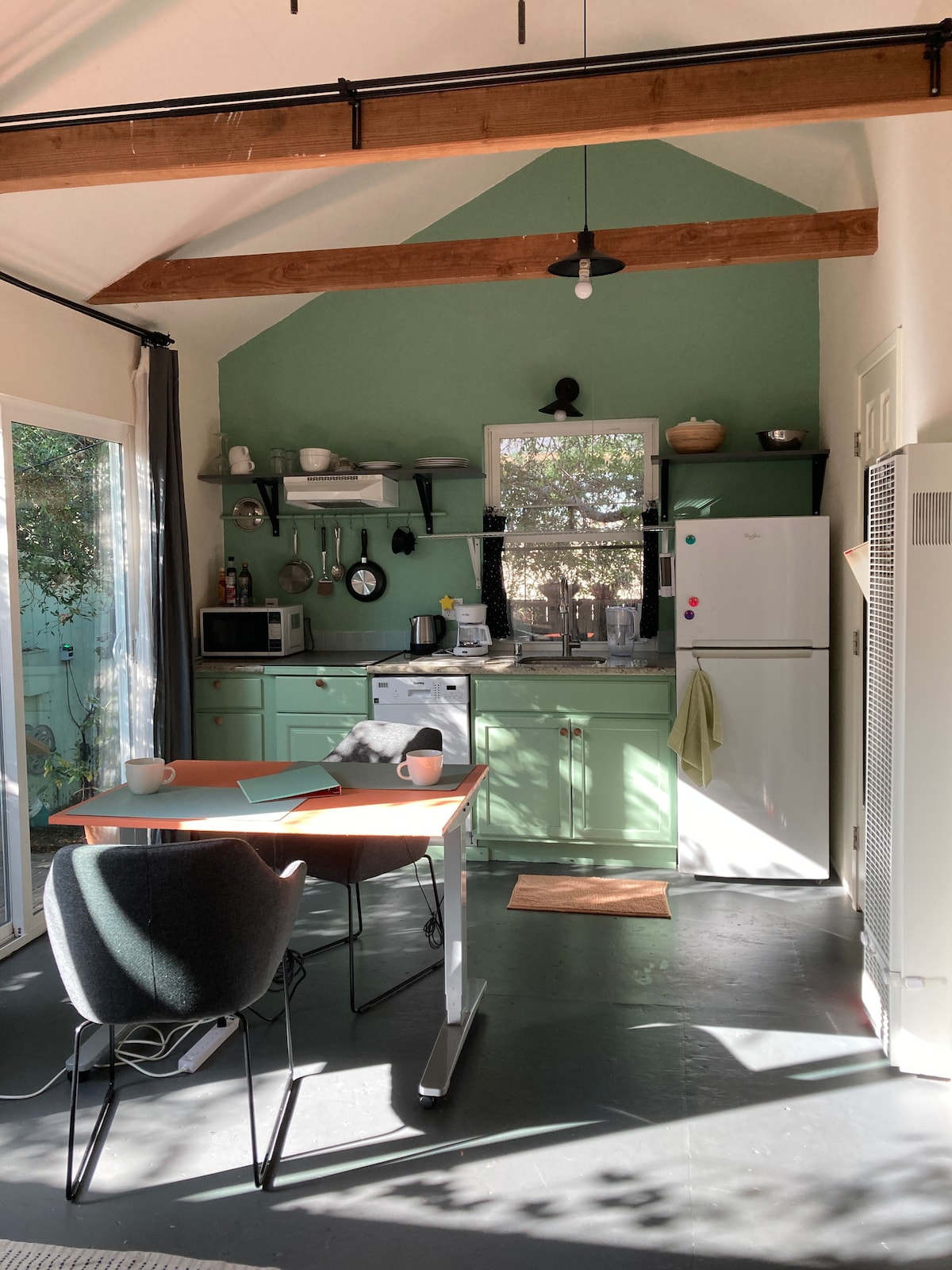 Vores lille gæstehus er helt adskilt fra hovedhuset og tilbyder et roligt, komfortabelt og privat sted til arbejde og/eller afslapning. Nyd haven med en stor terrasse, Adirondack-stole, parasoller og stort spisebord. Parkering på stedet. Dine gæsteområder er placeret inde i samme struktur som vores private træningsområde.