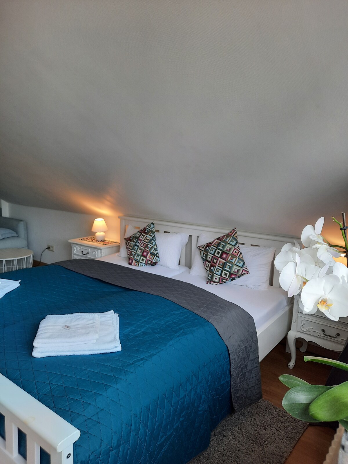 The in 2019 builted 538 sq ft apartment is located on top of the garage of our architect's house in a quiet residential area 11 km away from Europapark. It has a separate entrance and consists of a spacious room with box-spring double bed (2m x 2m), sofa and dining area with unobstructed views of the nature (biotope). There is also a separate fully equipped kitchen and a bathroom with a walk-in shower. Wi-Fi and TV available. Furthermore, there is a separate parking space.