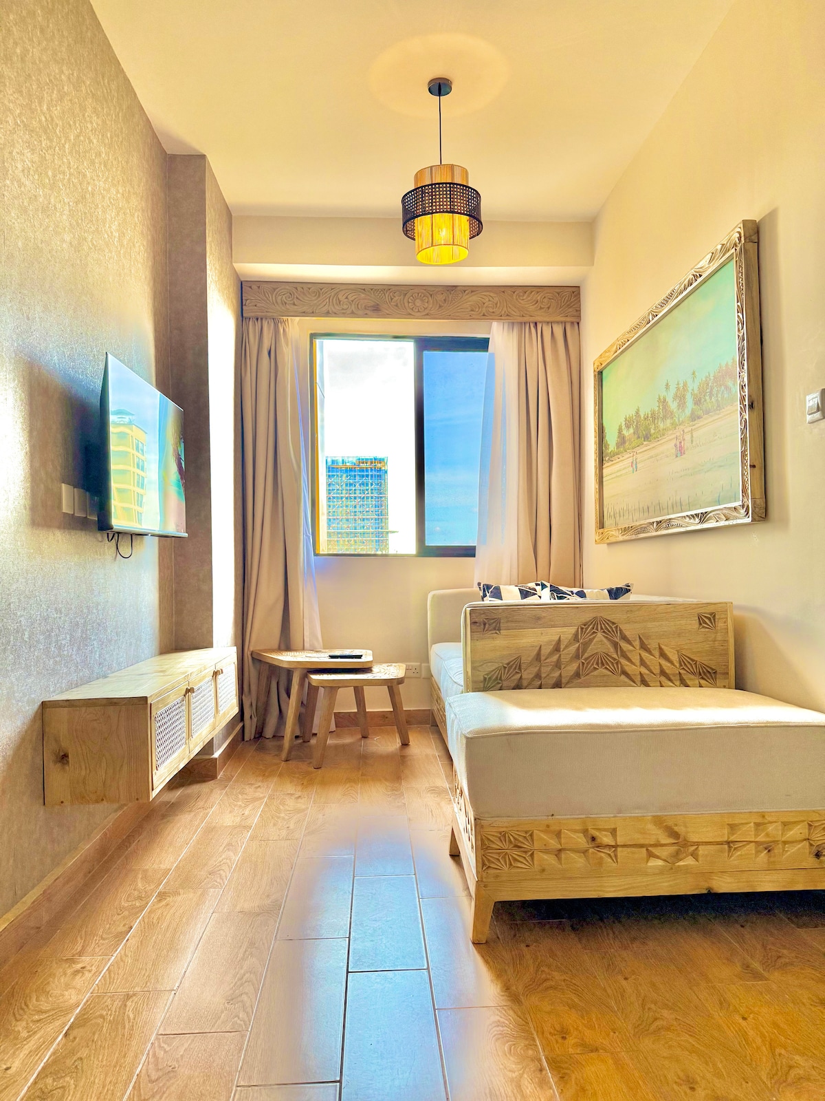 Vælg ren og overskuelig energi, og du vil finde denne lejlighed udstyret til de mest kræsne gæster. Boligen er minimalistisk med en farvetone, der passer til den moderne indretning med et strejf af japansk Wabi Sabi-stil. Farverne er rolige og neutrale, og komfort er standard. Væg til væg-glasfacadevinduer oversvømmer rummet med naturligt lys (og varme). Vil du have en siesta? Bemærk: Fitnessrum og pool er betalt for gæster, der bor +30 dage