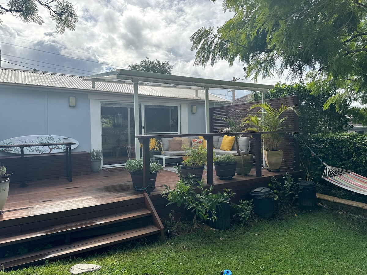 "The deck" is a delightful backyard cottage in a leafy Aussie suburb close to the N beaches sites-(Manly, Freshwater, beautiful beaches, Westfield) . It is freshly furnished & styled with a new kitchen (Nov 2025) TV, bathR, Q bed & has large priv sun filled deck. across the road from beautiful Manly dam- popular for mountain bike riding & bush walks . V Quiet yet close to everything. 7 mins to Manly beach and 25 mins to Sydney CBD, 5 mins to Warringah Westfield. 10 mins walk to the bus stop.