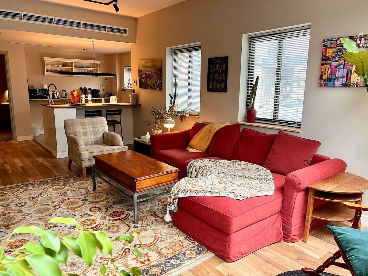 En hyggelig og stilfuld bolig med karakter fra midten af århundredet. Denne lejlighed med et soveværelse har en kingsize-dobbeltseng, en komfortabel stue med en sovesofa (plads til yderligere 2 gæster) og varme vintage detaljer overalt. Beliggende i stueetagen for nem adgang. Mid-century gulvlejlighed | Kingsize-dobbeltseng + sovesofa Klassisk lejlighed fra midten af århundredet. Det har et soveværelse med kingsize-seng og en stue med sovesofa til yderligere to personer med varme og klassiske dekorationer. Beliggende i stueetagen for tilgængelighed