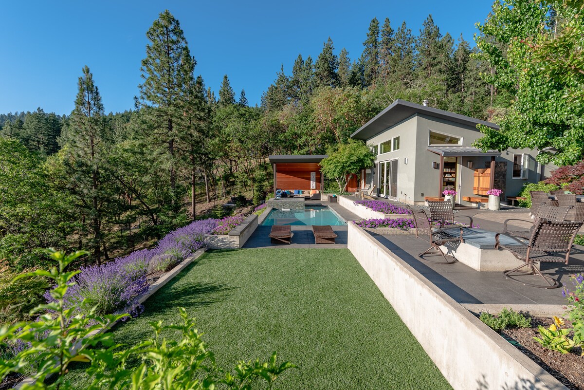 The Aloha House is located just above the University and only 1.5 miles from downtown Ashland. Nestled up a hill in the forest, you'll be transported to your own little private resort-like getaway with stunning views, architectural design that brings the outdoors in, and ample space for dining and entertaining poolside. The property consists of two separate studios (both included) connected by a unique outdoor living space with a seasonal pool, spa, outdoor shower, bar & BBQ, and more!
