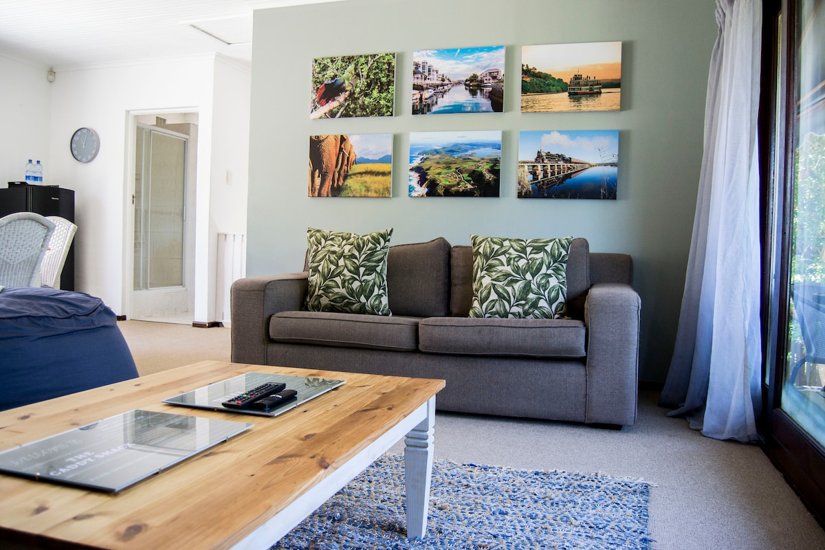 Selvforsynende, fuldt udstyret stor hytte med topmoderne apparater og luksuriøst badeværelse. Meget privat med smuk udsigt over Knysna-lagunen. Gæsterne vil nyde at sove på en smuk queensize-seng med sengetøj i egyptisk bomuld og en enkeltseng. Køkkenet har gaskomfur og mikrobølgeovn. Masser af privat parkering og tæt på byen og spisesteder. Lejrseng til rådighed. Goose Cottage er ikke tilsluttet elnettet, så under strømafbrydelser er vi fuldt funktionelle.
