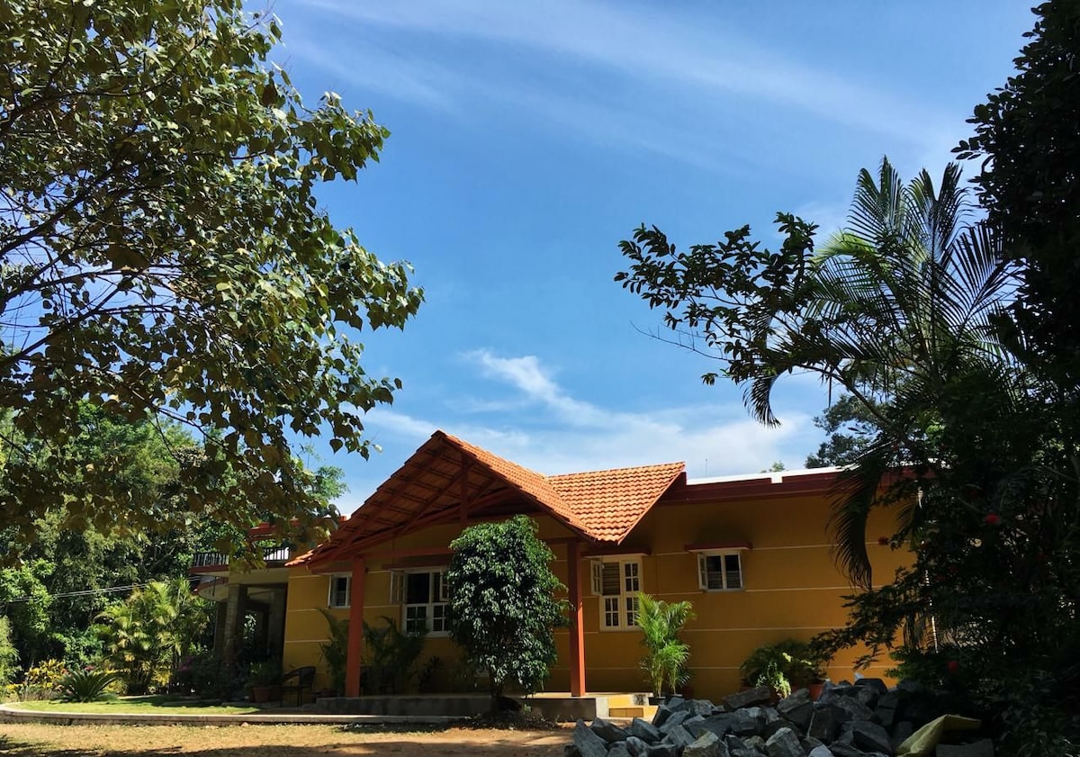 En fredelig bungalow med 3 soveværelser gemt væk i hjertet af vores frodige kaffeplantage i Coorg – perfekt til en gruppe venner eller en stor familie, der ønsker at slappe af, genoprette forbindelsen og lade op. 15 minutter fra byen tilbyder bungalowen fuldstændig afsondrethed midt i naturen.De eneste lyde, du vil høre, er raslen af blade, fuglekvidder (15 forskellige arter er set) og den lejlighedsvise støvregn, der forvandler hele ejendommen til et grønt, tåget eventyrland. Jeg glæder mig til at byde dig velkommen med simpel hjemmelavet mad og privatliv.