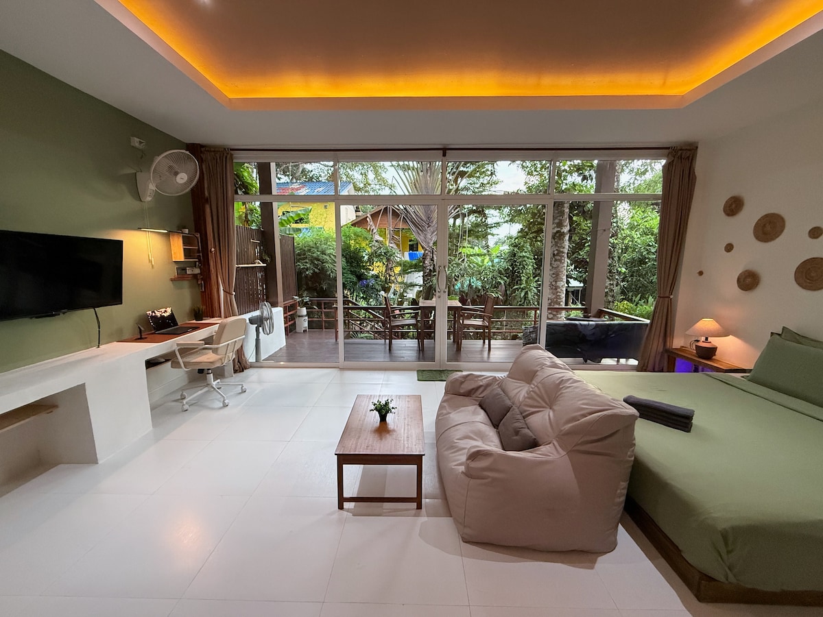 Bungalow ved stranden på Sai Noi Beach inkl. et køkken med fantastisk havudsigt og en rummelig balkon til enhver aktivitet eller afslapning med en bog om aftenen. Badeværelset er nyligt renoveret. Bungalowen ligger, hvor junglen møder stranden, 10 meter fra vandet, perfekt til snorkling, kajak og paddleboard. Perfekt til yoga( vi har ugentlige kurser på stranden) tæt på fiskerlandsby, smukke strande og shopping. Nyd vores hyggelige strandbar med grill, sunde smoothies og møde andre rejsende!