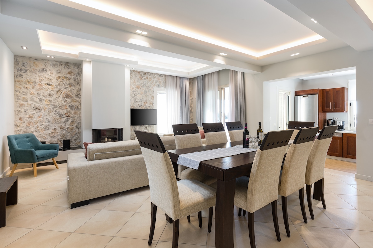 Huset med havudsigt ligger 4,7 km fra Korfus centrum , 7 km fra Korfu lufthavn og 4,5 km fra Korfu havn . Gouvia Marina ligger kun 5 km fra ejendommen Denne unikke ejendom kombinerer stil, størrelse ,komfort og betagende udsigt Hvis du leder efter en hjemlig atmosfære ,en vidunderlig, afslappende og mindeværdig ferie, er dette stedet at være ! Vi vil være der for at give dig alle nødvendige oplysninger om øen og tilbyde dig udsøgt service og græsk gæstfrihed .