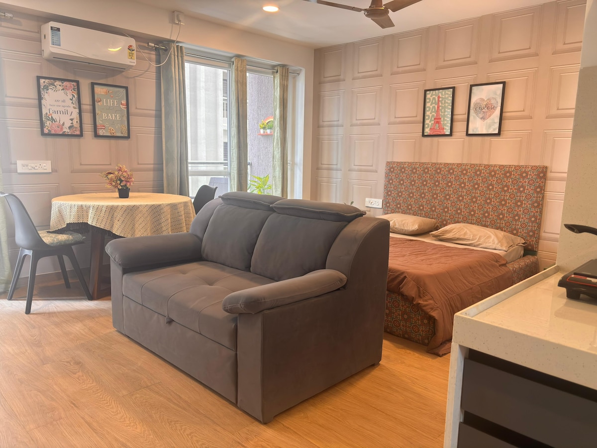 ✨ Gennemtænkt designet studio nær Pune Lufthavn – komfort, ro og bekvemmelighed i ét ophold. 🌿 Nyd hyggelige interiører, hurtig wi-fi, aircondition, smart-tv og en balkon, der er perfekt til morgenkaffe. Let madlavning i tekøkkenet og nem indtjekning. Ideel til forretningsrejsende eller par, der søger fred og privatliv. Ingen kæledyr, alkohol eller fester. Rygning kun på balkonen. Din fredelige byferie venter. 🌸 🌿 Særlige besparelser på længerevarende ophold – 12 % rabat på ugentlige og 22 % rabat på månedlige bookinger.