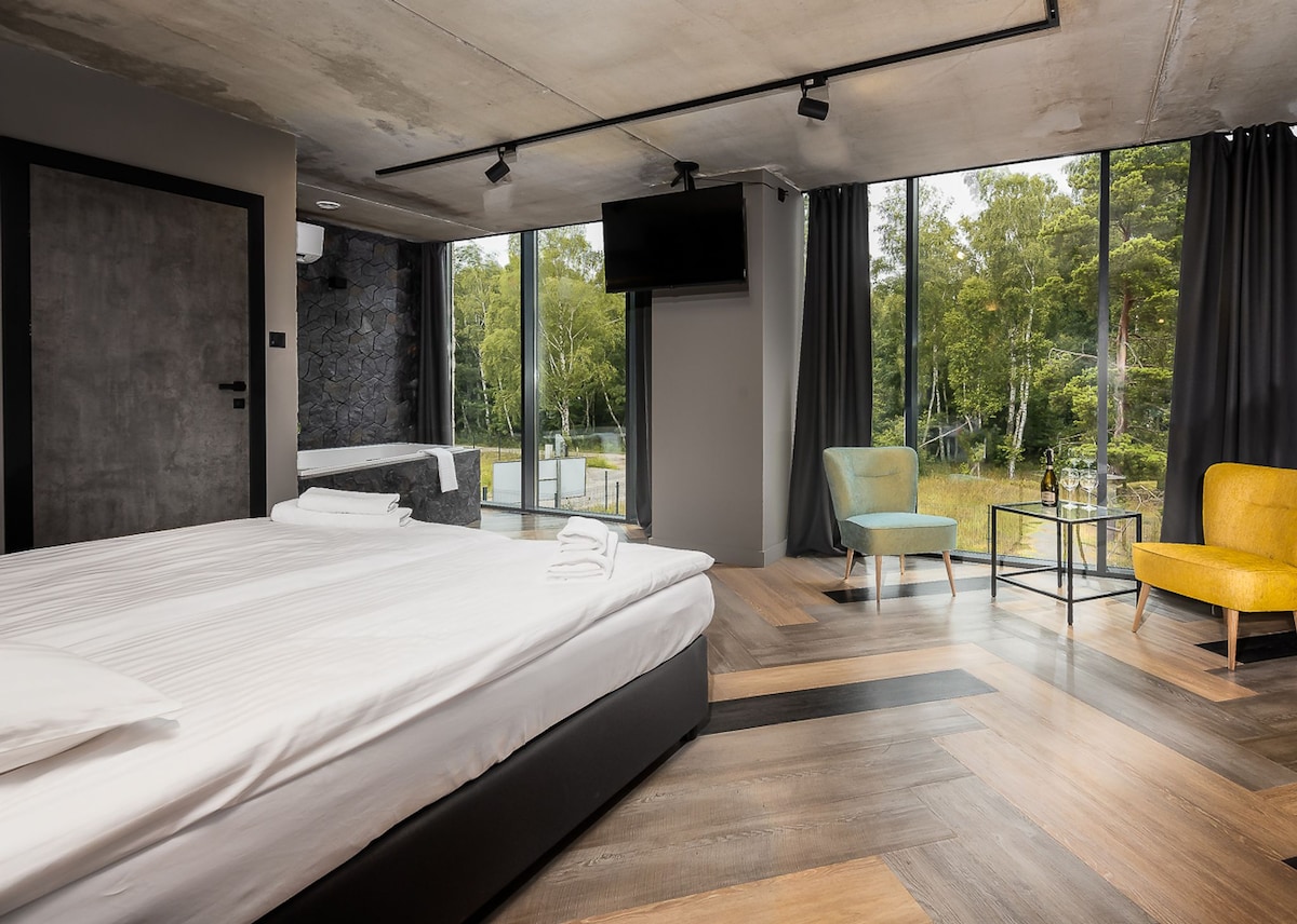 Luksusowy, klimatyczny apartament z jacuzzi jest usytuowany w Mielnie,200 metrów od morza, nad jeziorem Jamno. Obiekt wyłącznie dla dorosłych, w pobliżu ustronna plaża. Apartament z prywatną wanną z hydromasażem, wyposażony w telewizor z płaskim ekranem. Panoramiczne okno z widokiem na las. Łazienka z prysznicem i w pełni wyposażony aneks kuchenny. Dodatkowe udogodnienia obejmują salę fitness, taras. Na miejscu za dodatkową opłatą trening EMS oraz masaże relaksacyjne.