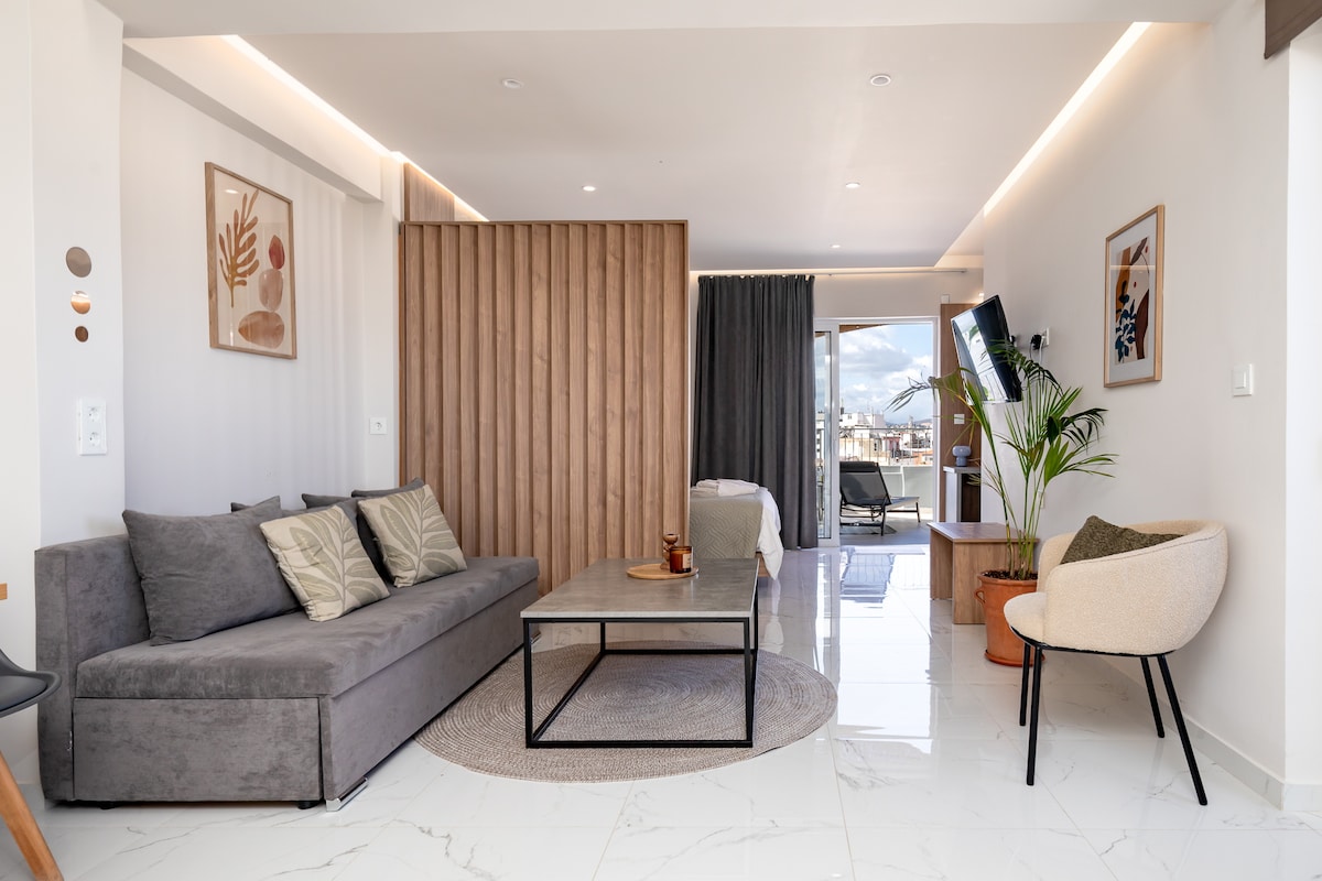 Lejligheden er designet omkring den uhindrede udsigt og giver mulighed for at være i kontakt med havet fra ethvert synspunkt. Eksotiske elementer, træ og enkle former kombineret med bløde farver skaber en let sommerstemning, der er ideel til en ferie ved Koum Kapis kyst