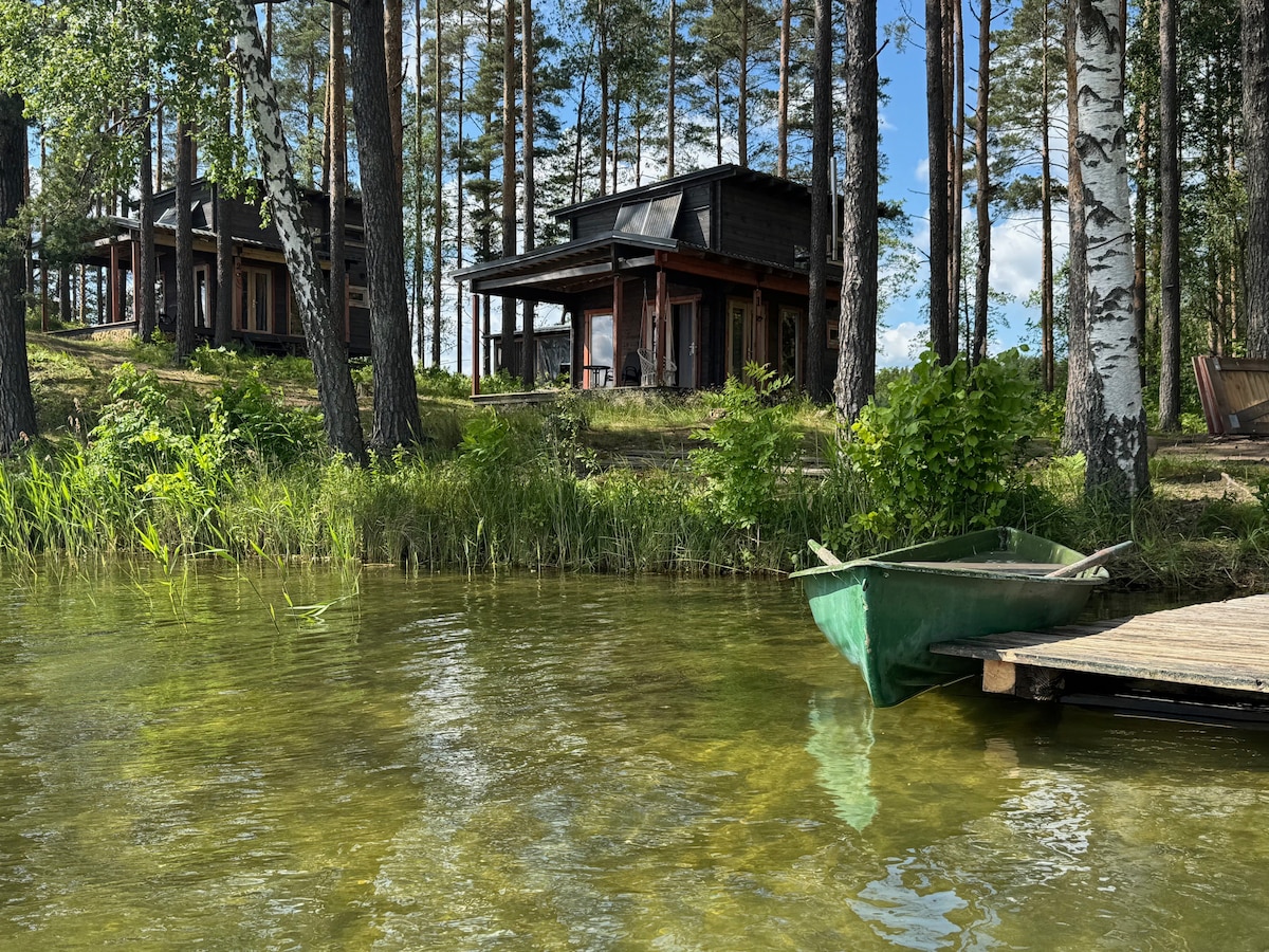 Gæstehytter beliggende i skoven ved Lake Rushon. Der er små terrasser ved hytterne. Området har en børneplads,en lille have og en kaninhytte, der vil glæde de små beboere. Der er også både til rådighed. Der er også en stor terrasse med en lille festplads, som ligger ved selve søen, hvor du kan nyde morgenmad i ro og mag. For gæsterne er der en moderne sauna. Gæstehytter har alt, hvad du behøver for at slappe af - et brusebad, et toilet og alt, hvad du har brug for til at lave mad på stedet.