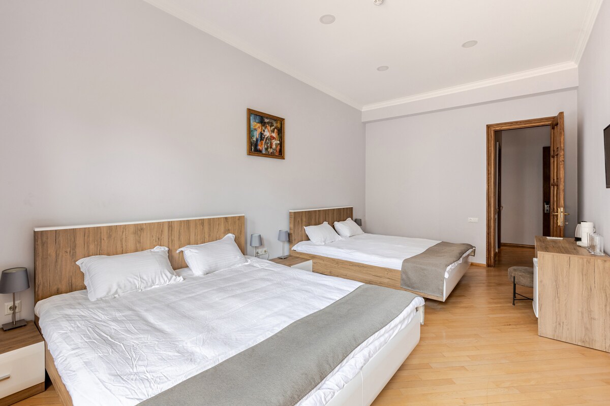 Lyst, rummeligt værelse med to queensize senge, perfekt til familier eller venner. Passer til op til 4 gæster. Inkluderer et privat badeværelse med badekar, balkon med siddepladser, gratis Wi-Fi, TV, pengeskab, minikøleskab, elkedel med kaffe og te. Håndklæder, sengetøj, badekåber og toiletartikler er inkluderet. Fælles tekøkken og fælles arbejdsområde. Beliggende på Nikoloz Kipshidze Street i det centrale Vake. Kontaktløs ind-/udtjekning for et problemfrit ophold.