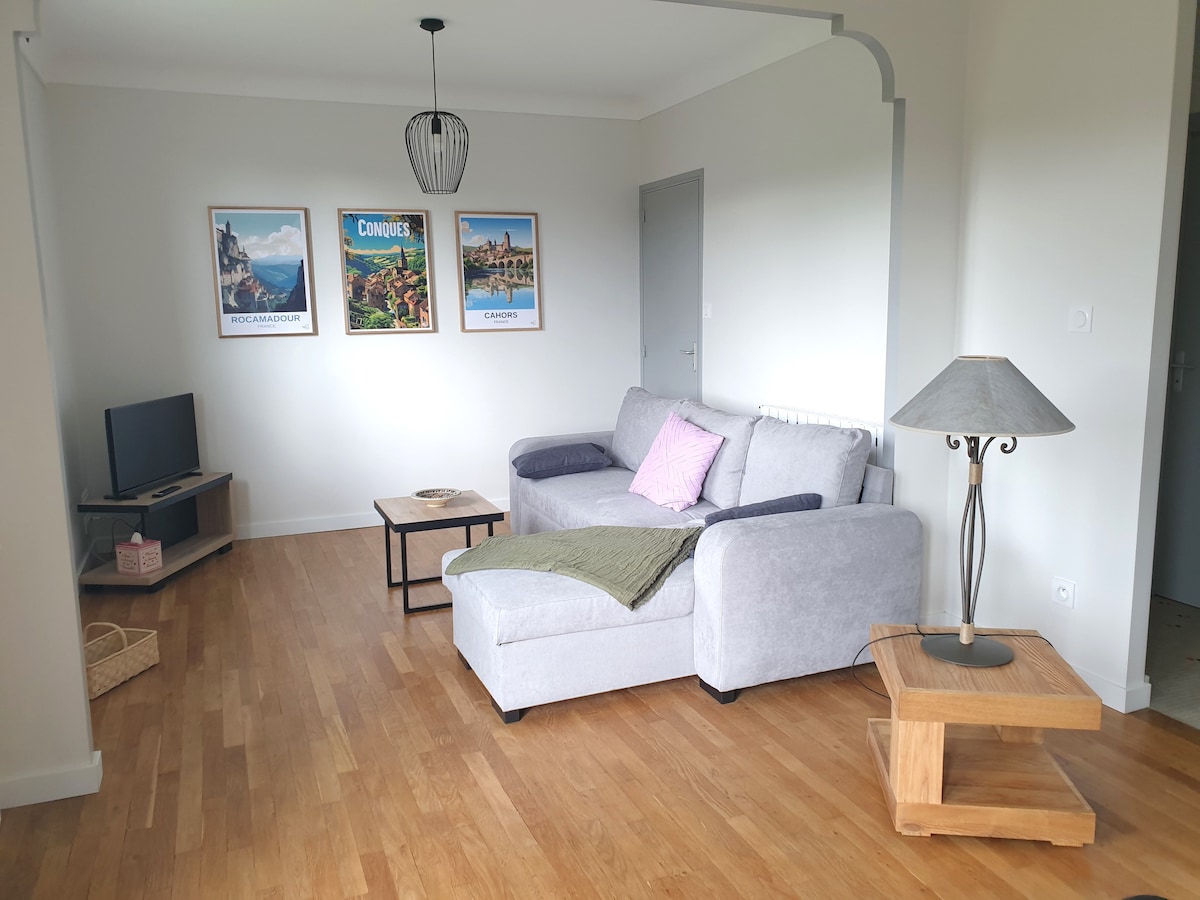 Uafhængig lejlighed med 1 soveværelse (dobbeltseng), 1 stue med en sovesofa (til 2 personer), sengene vil være redt ved ankomsten, åbent køkken. Fri udsigt, terrasse med grill, lille privat have. TV & WiFi inkluderet. Tæt på vandrestier og mountainbike. I nærheden af Villefranche de Rouergue og dens marked hver torsdag, Aqualudis, stedet for Calvaire, Dolmens, Belcastel, Najac, Saint-Cirq-Lapopie, Jean Marie Périers fotohus. Soulages-museet i Rodez.